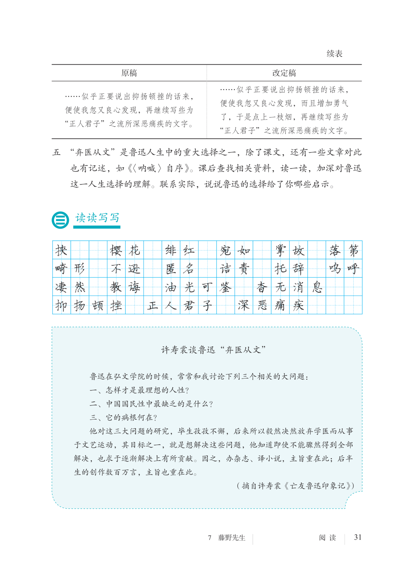 增加“而且增加勇气了”一句,表现出作者在国内严酷的政治环境中,一想到藤野先生对自己乃至对中国的希望,便增加了斗争的勇气和继续战斗的决心。“于是点上一枝烟”,增添了形象感,表现出作者对“正人君子”们的蔑视。