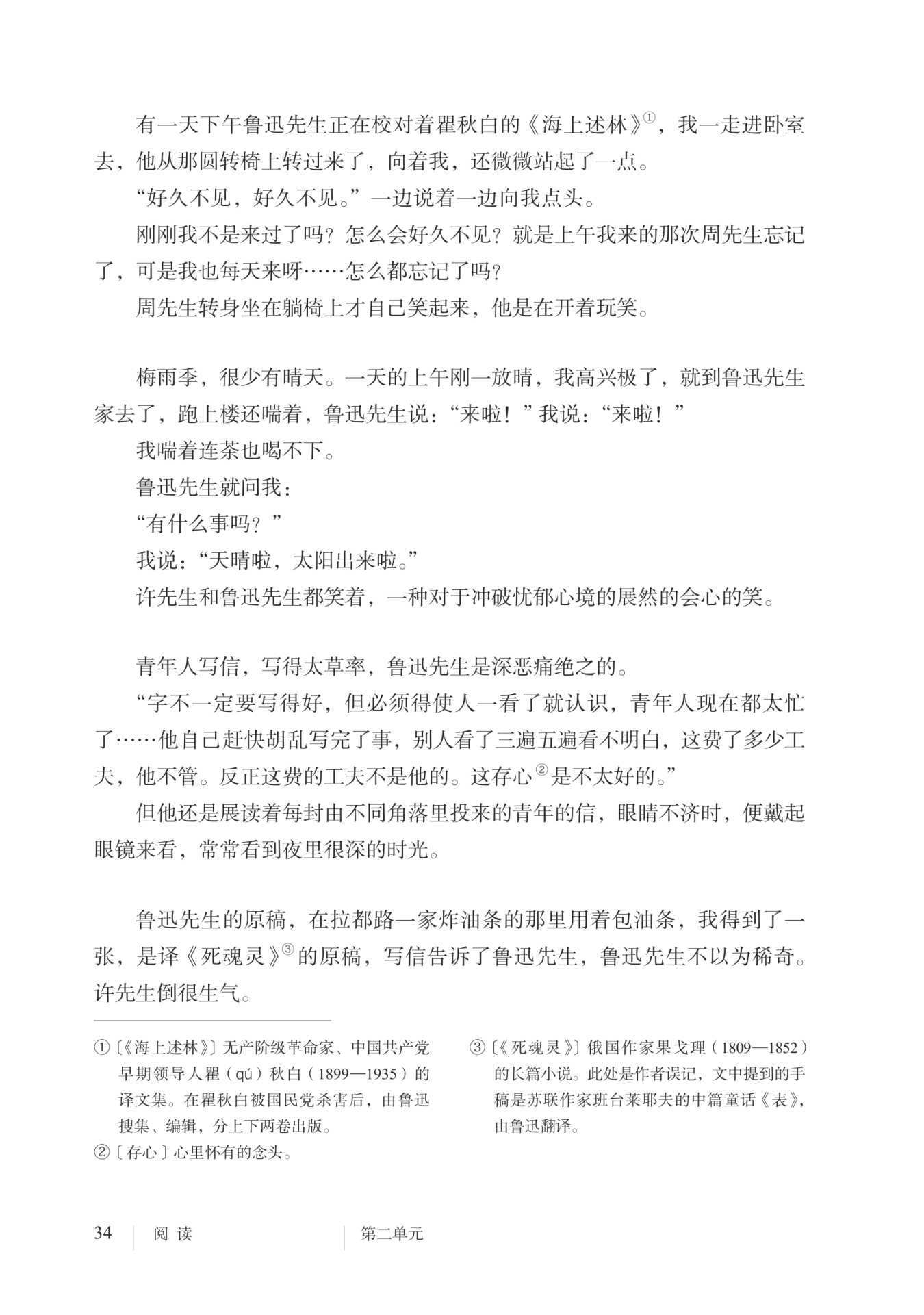 描绘了一幅其乐融融的画面,说明许先生和鲁迅先生懂得“我”这句话背后的意思,也深有同感。