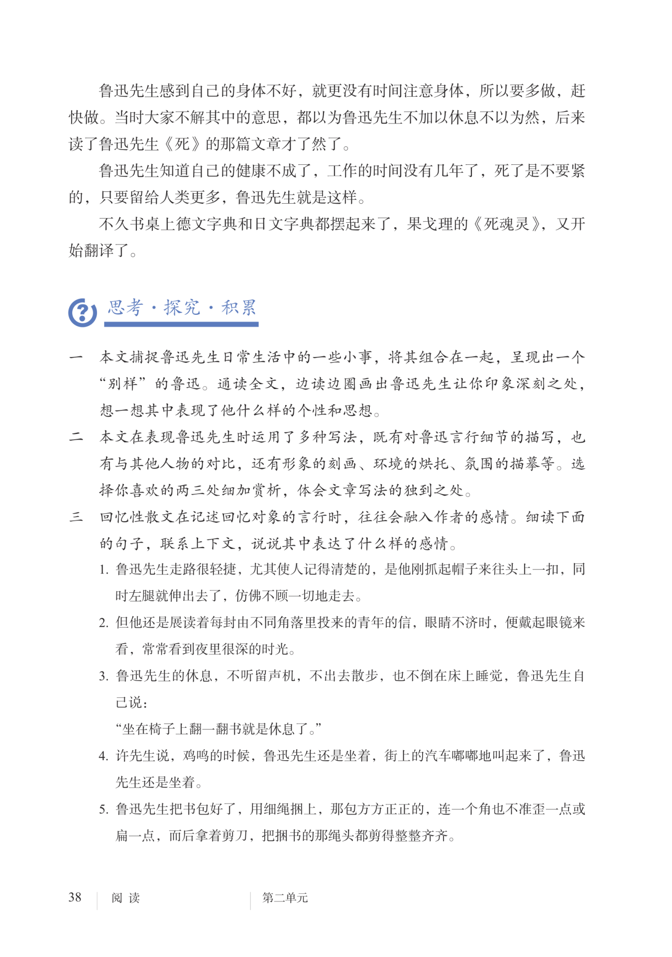 写出了鲁迅先生生前的紧迫感,表现了他不惧死亡的淡然和争分夺秒工作的勤奋。