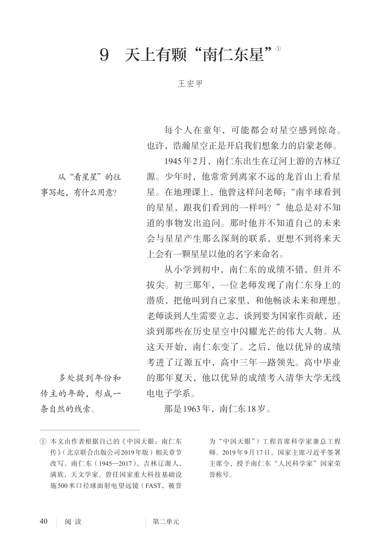 本文通过叙述南仁东少年时好奇星空、青年求学、毕业后到工厂实践,直至主导“中国