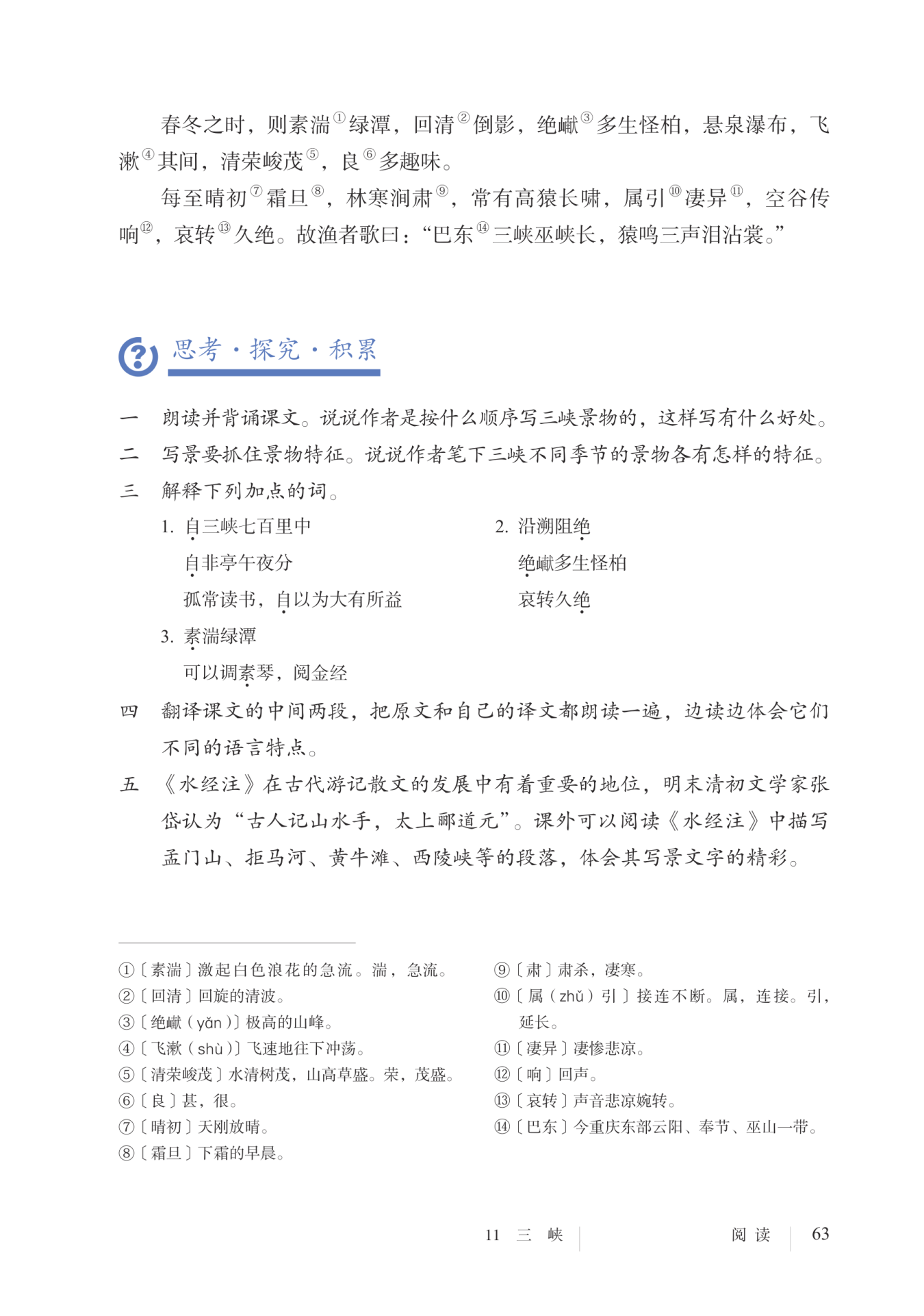 到了夏天江水漫上山陵的时候,下行和上行的航道都被阻断,不能通航。倘若碰到皇帝的命令要急速传达,有时候清早(坐船)从白帝城出发,傍晚便可到达江陵,中间相距一千二百里,即使骑着飞奔的马,乘风飞行,也没有这么快。在春、冬两个季节,激起白色浪花的急流中有回旋的清波,绿色的潭水中倒映着各种景物的影子,极高的山峰上多生长着奇形怪状的柏树,悬泉瀑布在山峰之间飞速地往下冲荡。水清树荣,山高草盛,有很多趣味。