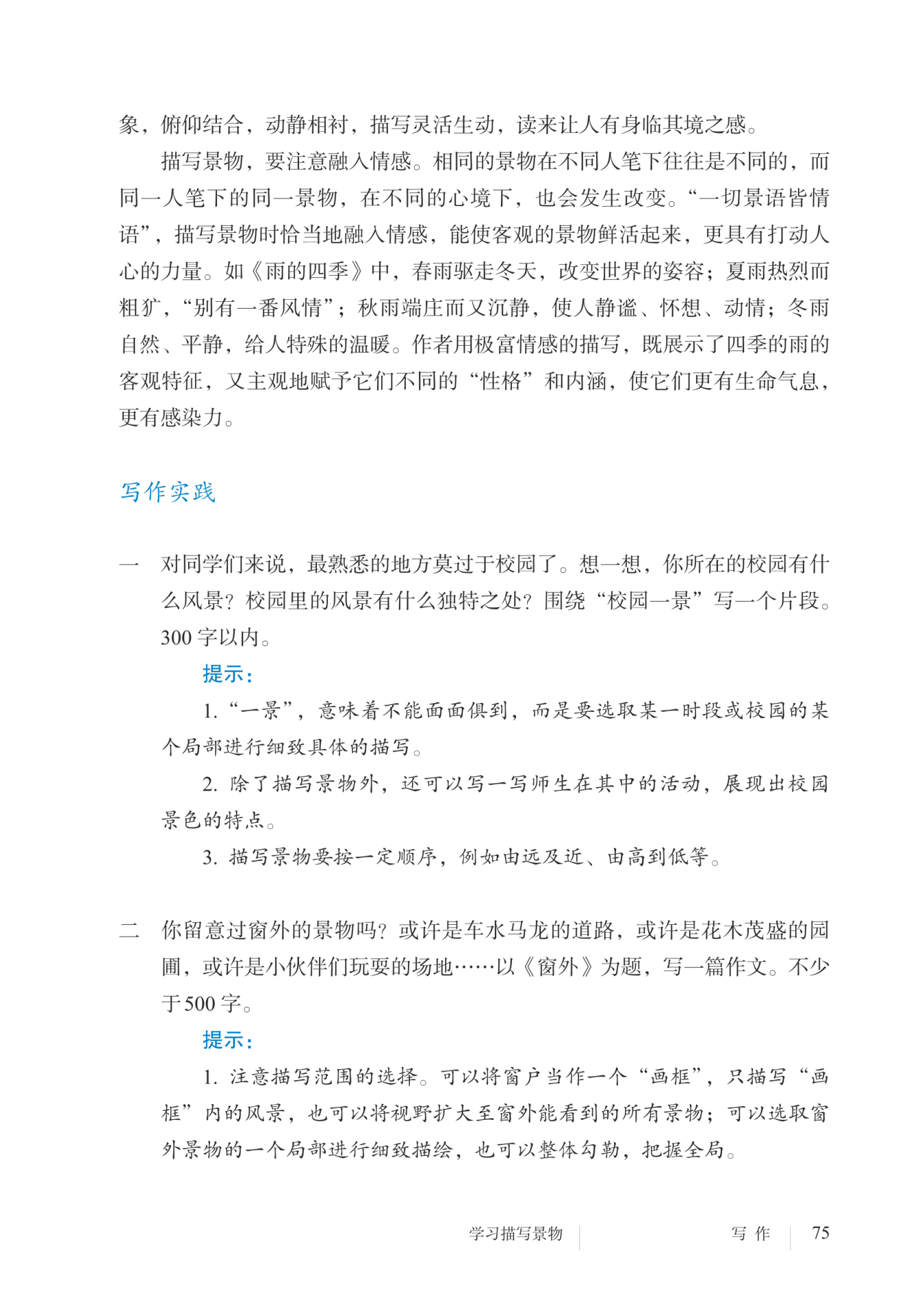 选材:写窗外之景,既可选一个景物的局部进行描绘,也可整体勾勒。