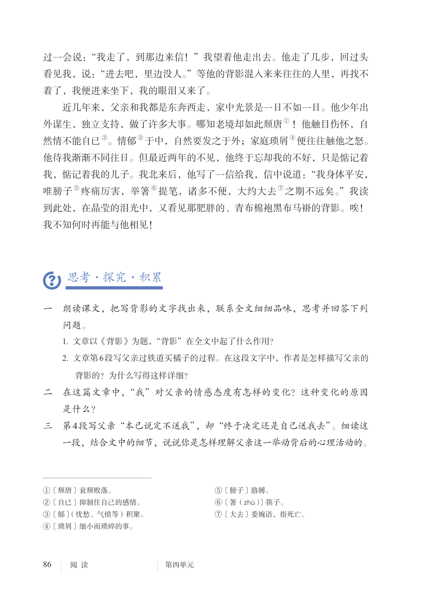 4.我读到此处,在晶莹的泪光中,又看见那肥胖的、青布棉袍黑布马褂的背影。