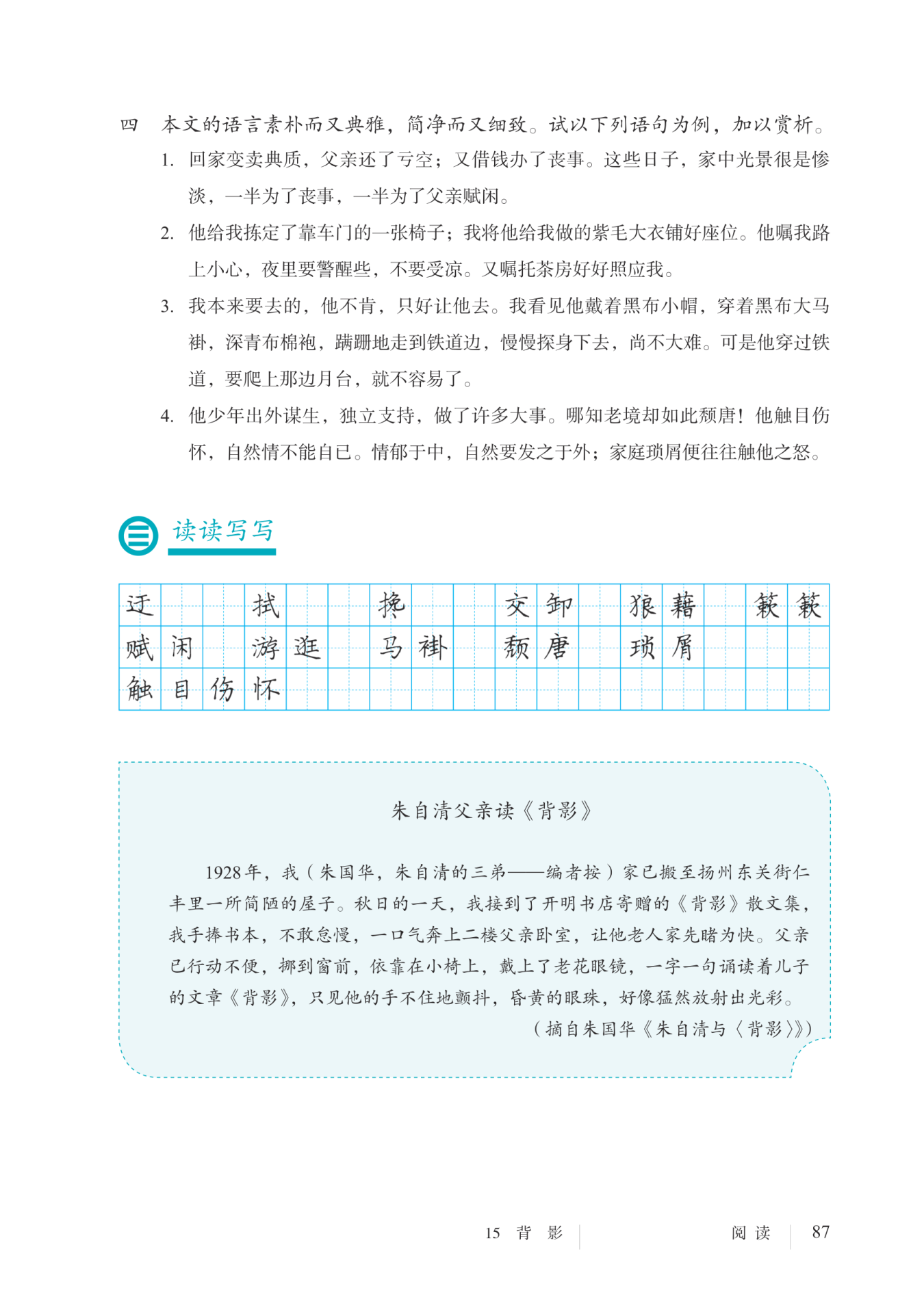 这短短几句话,用文雅的四字词语和接近文言文的句式,概括了父亲的人生历程。虽以第三人称来写,“哪知”“触目伤怀”等词语却写出了父亲的心境。连用两个“自然”,为父亲的发怒辩护,表现了“我”对父亲的理解。