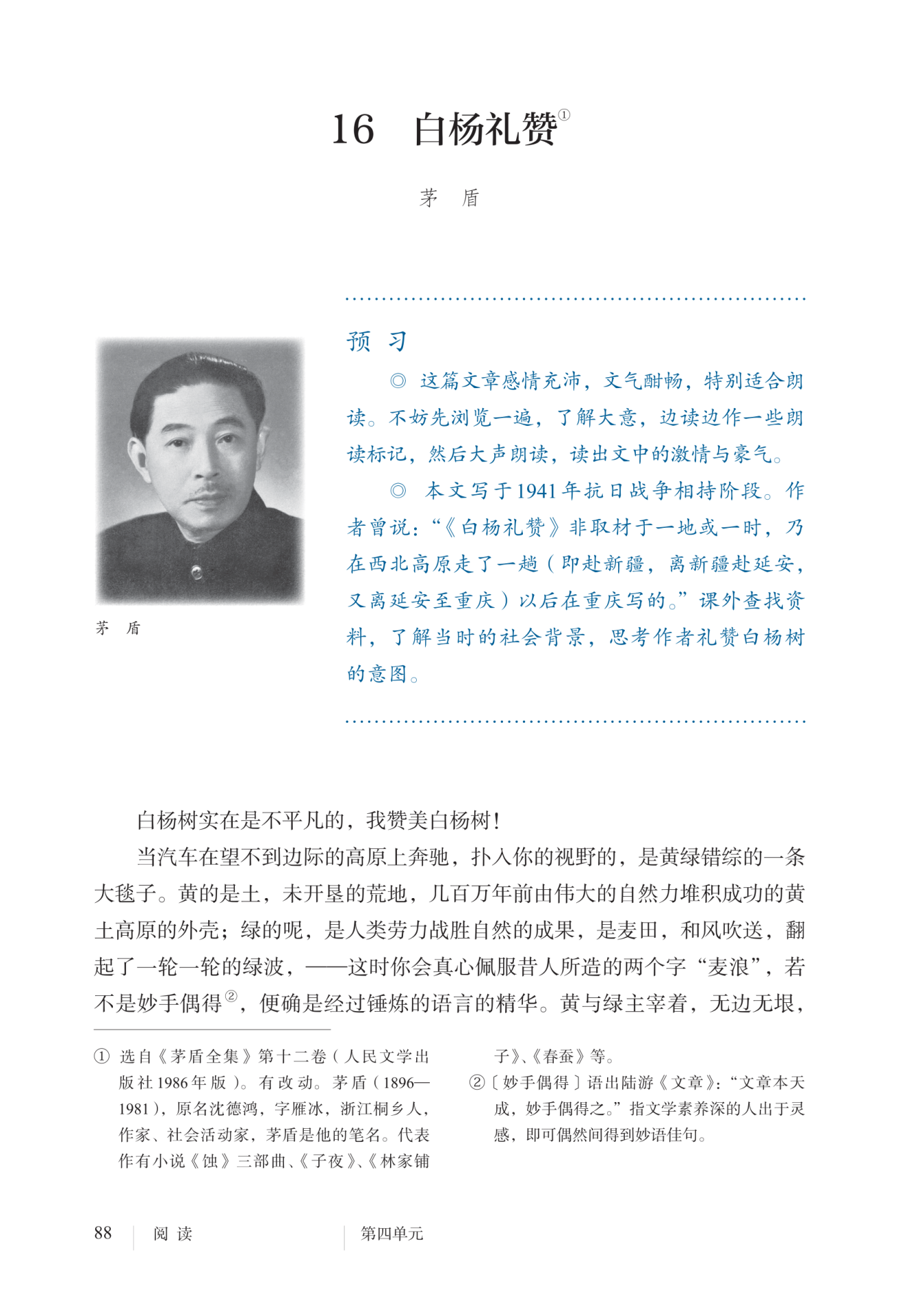 1940年,茅盾赴延安参观、访问、讲学。他亲眼目睹了北方军民在共产党的领导下同心同德、团结抗战的情形,从解放区的人民身上看到了民族解放的前途和希望,深受鼓舞,于1941年写下了这篇热情洋溢的散文。文章借赞美“西北极普通”的白杨树,讴歌了西北军民团结抗战的伟大精神和意志。