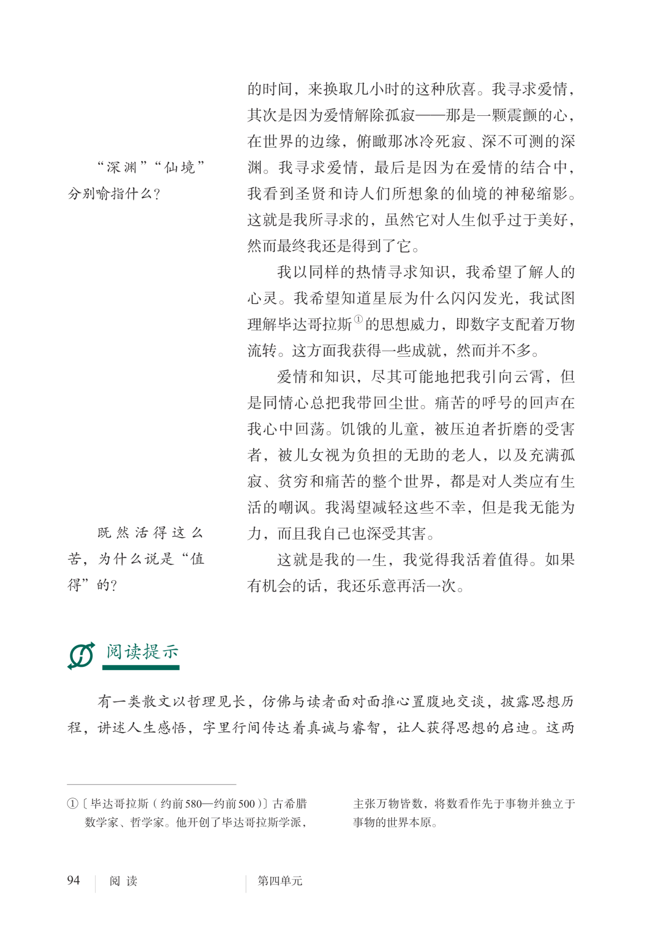 承上启下。“云霄”指美好的理想境界,“尘世”则指现实世界。对爱情和知识的追求将作者引向了理想境界,而对人类苦难的同情又使作者把目光投向了现实世界。