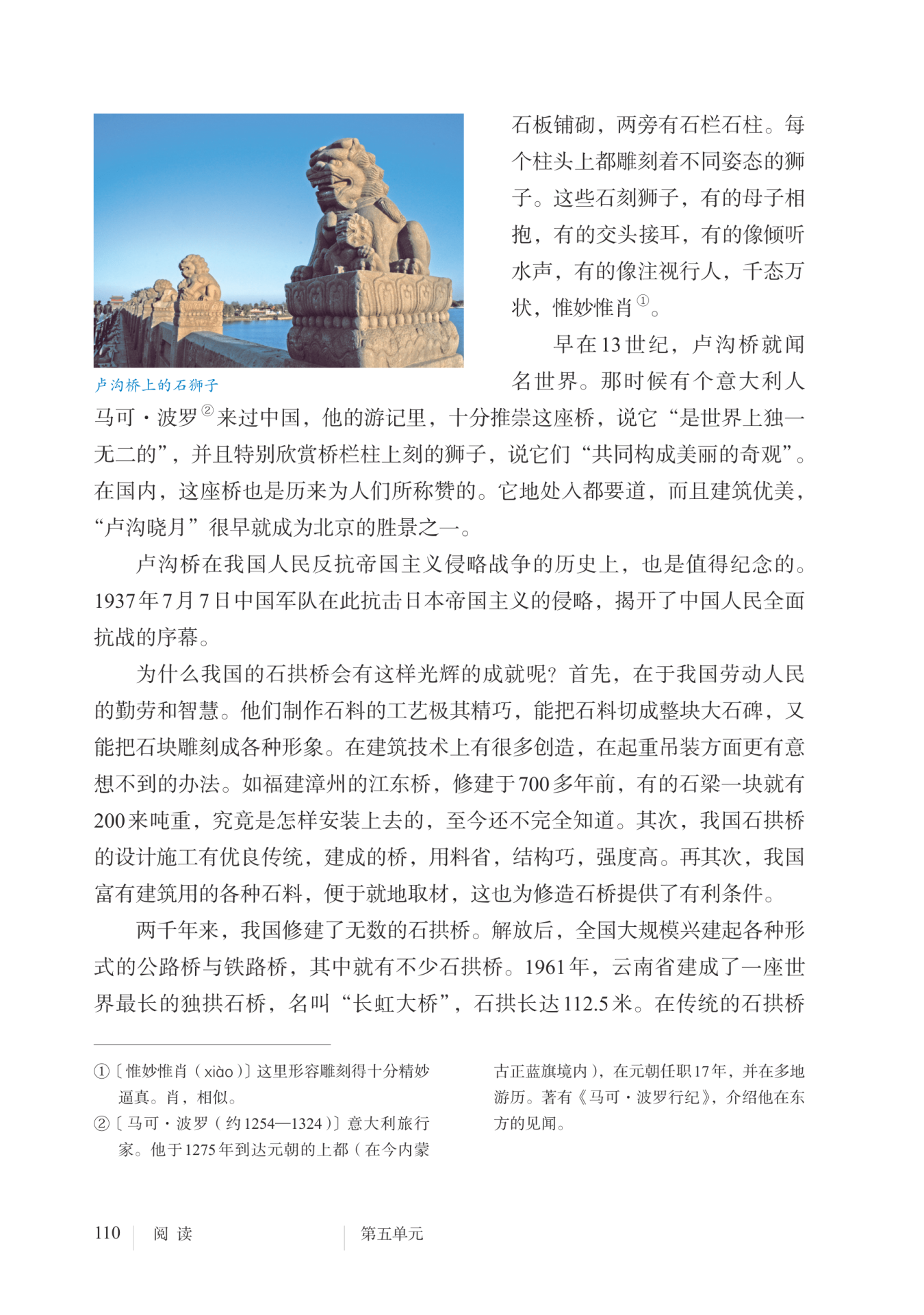 引用马可·波罗的话,进一步说明卢沟桥形式优美,极具艺术价值。