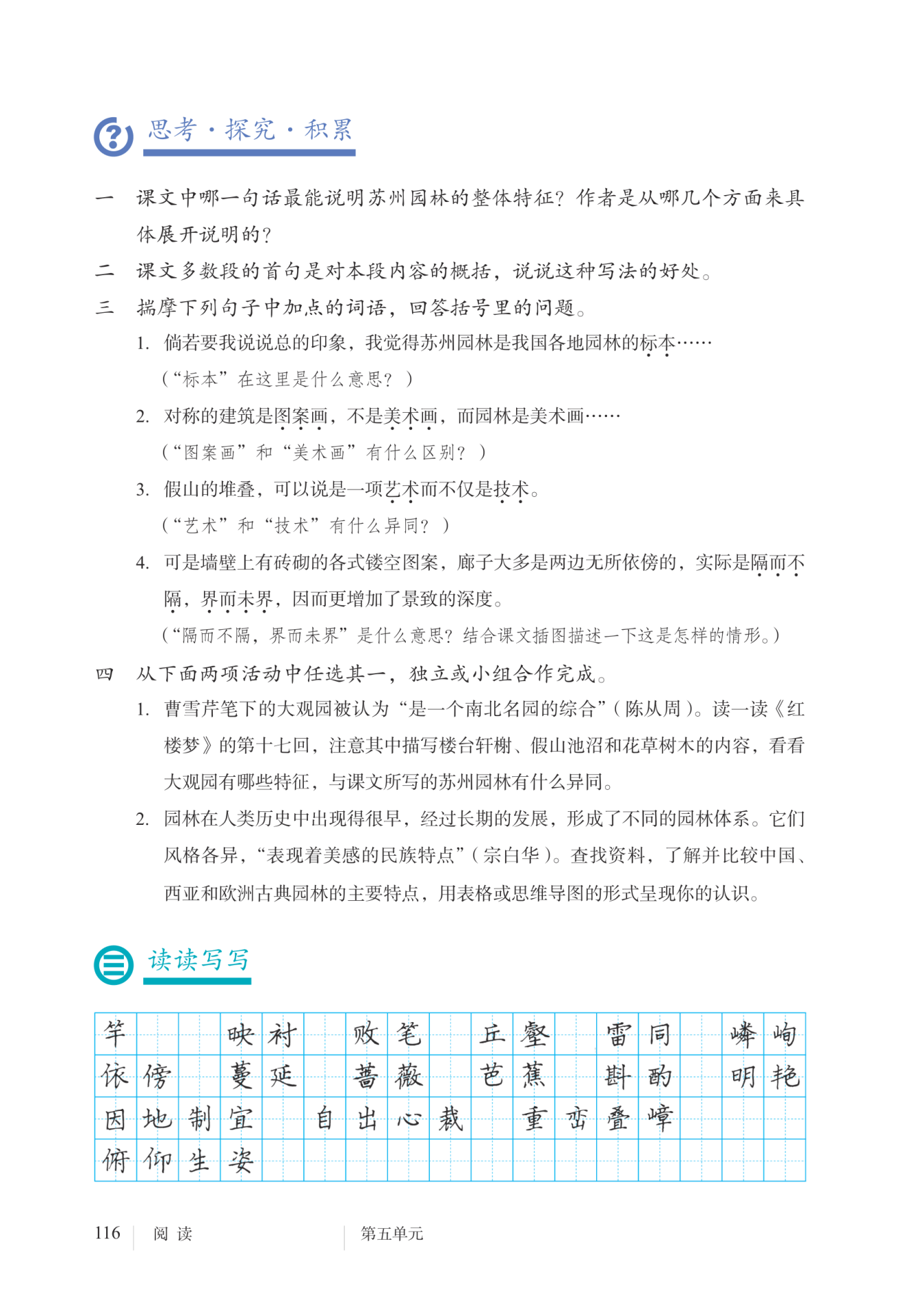 【提示】“相似之处”可以从描写大观园楼台轩榭、假山池沼和花草树木的内容入手,思考其与苏州园林在这些方面的共同特点。“不同之处”可以关注描写大观园建筑宏伟、富丽的内容,并与苏州园林进行对比;思考大观园建设的动因,分析其与苏州园林修建理念的差异;体会大观园风格多样与苏州园林追求自然的差异。