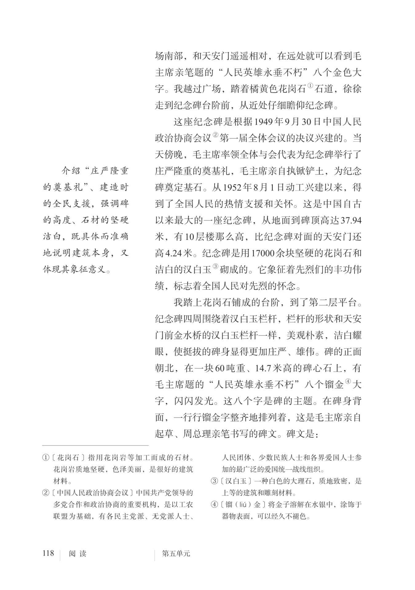 介绍碑身周围的汉白玉栏杆,突出其朴素、洁白的特点,衬托了碑身的庄严、雄伟。