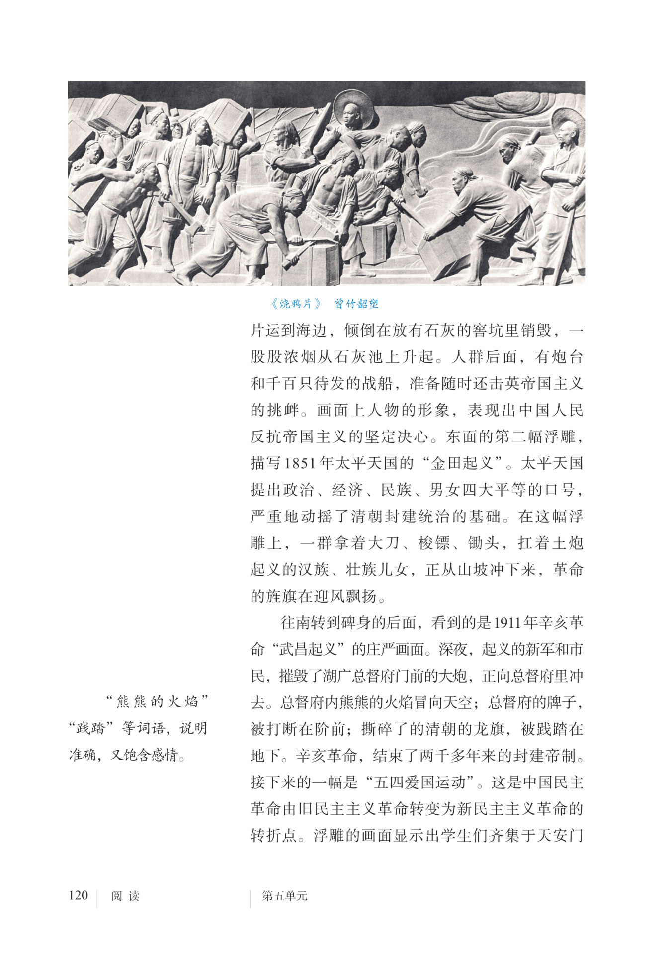 按由虚到实的顺序介绍第二幅浮雕,先写太平天国的历史意义,再具体描述画面。
