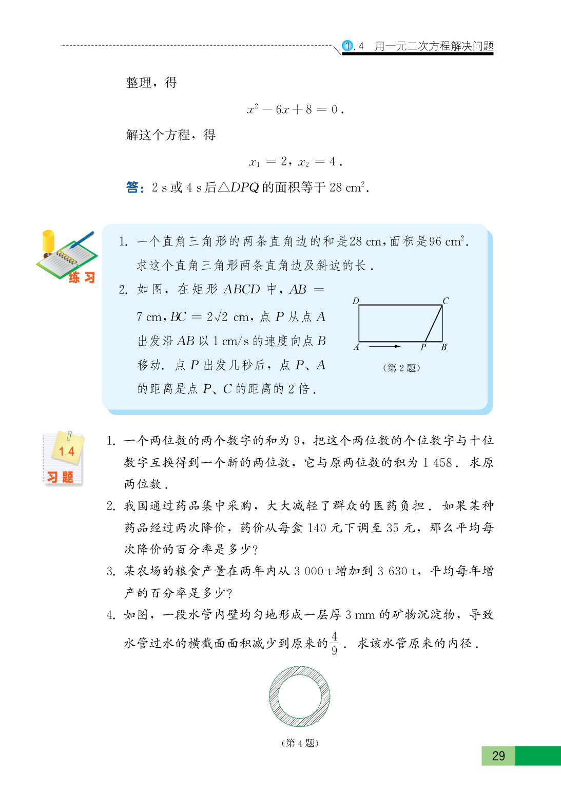 原来水管的横截面积为$\pi(\frac{x}{2})^2$,现在水管的内径为$(x - 2×3)=(x - 6)$mm,现在水管的横截面积为$\pi(\frac{x - 6}{2})^2$。