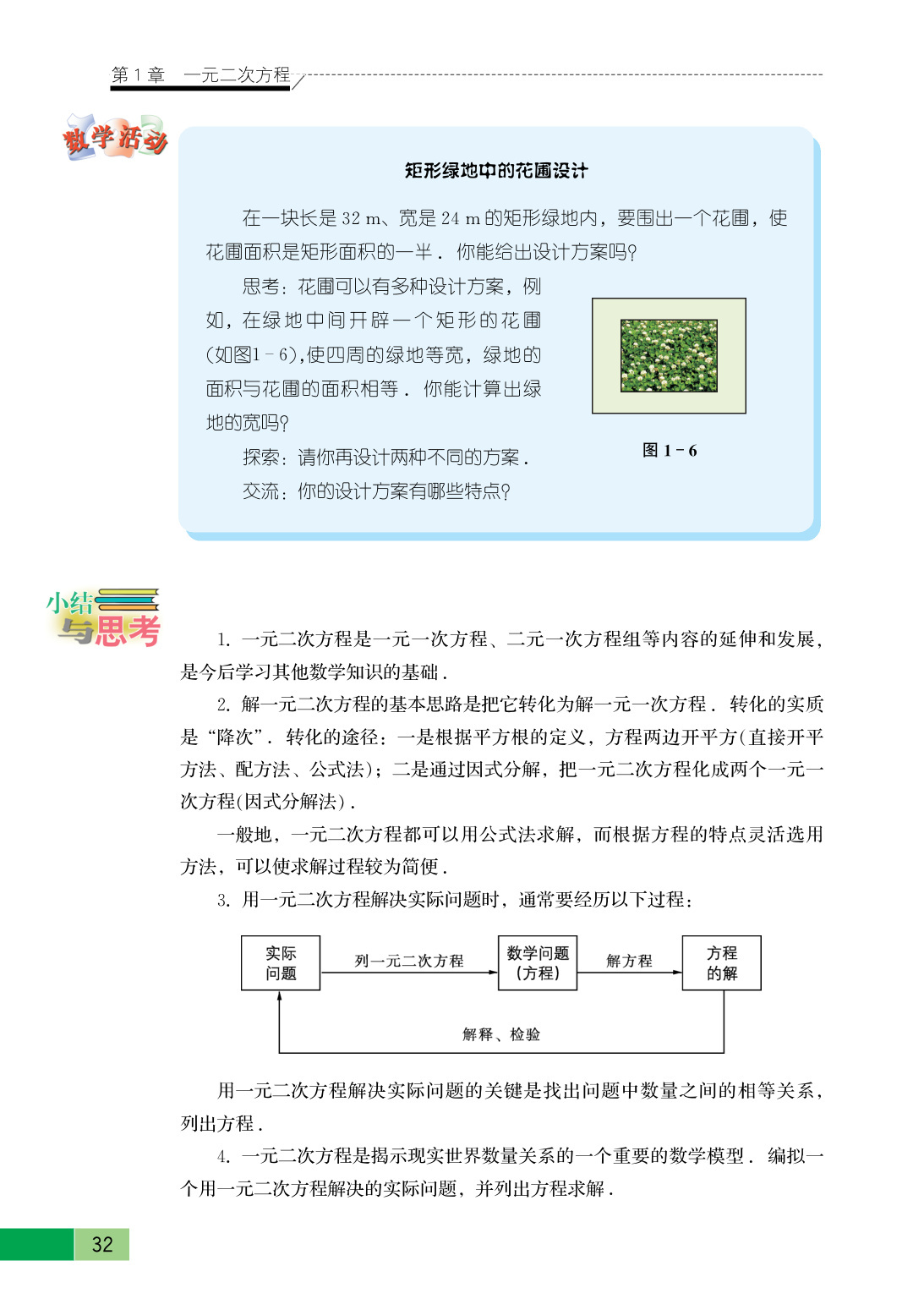 解得$ x_1 = 4 $,$ x_2 = 24 $(舍)则绿地的宽为$ 4 \, m $。
