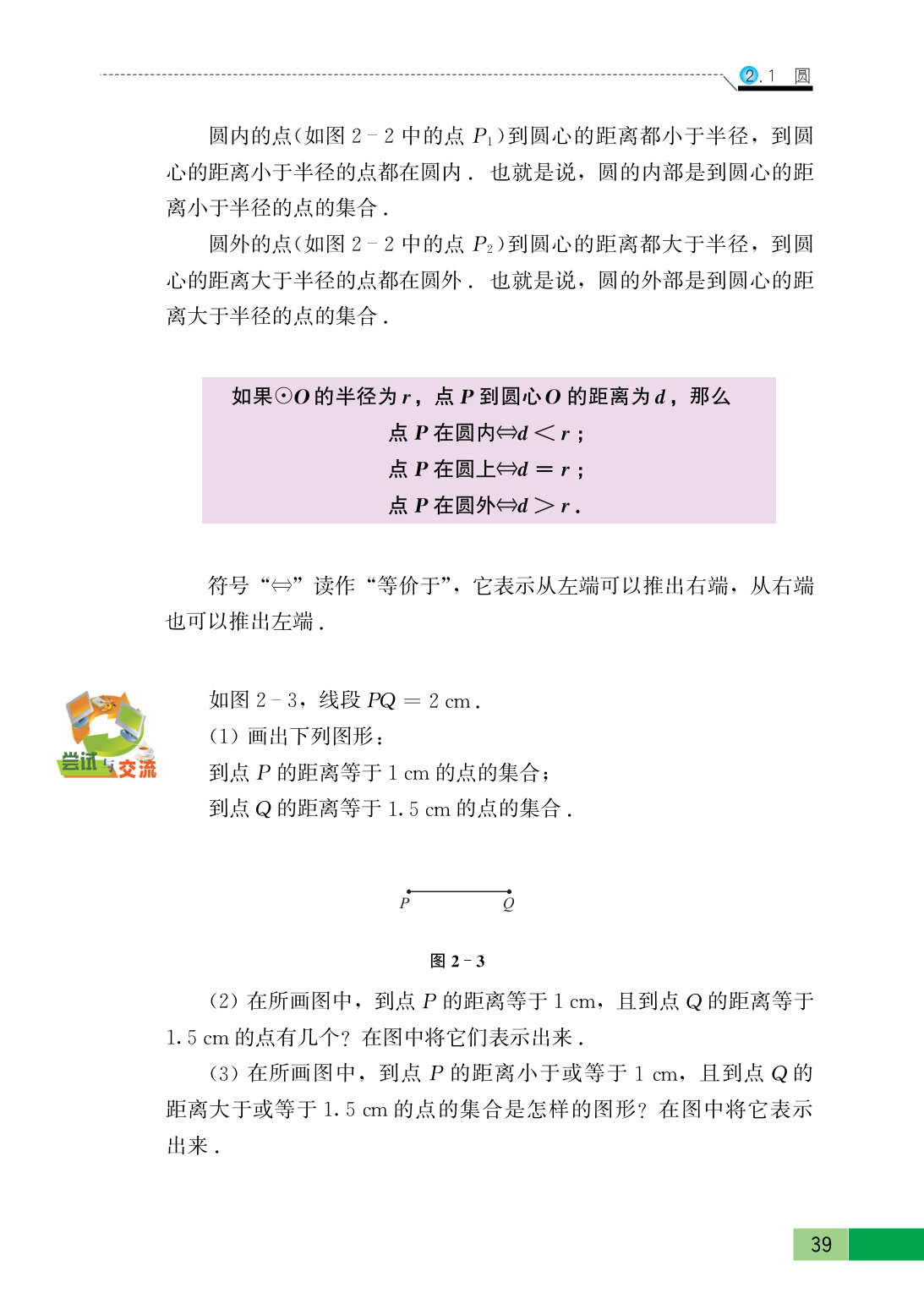 如图所示,到点$ P $的距离等于$ 1\ \mathrm{cm} $的点的集合是以点$ P $为圆心、$ 1\ \mathrm{cm} $为半径的$ \odot P $,到点$ Q $的距离等于$ 1.5\ \mathrm{cm} $的点的集合是以点$ Q $为圆心、$ 1.5\ \mathrm{cm} $为半径的$ \odot Q $.