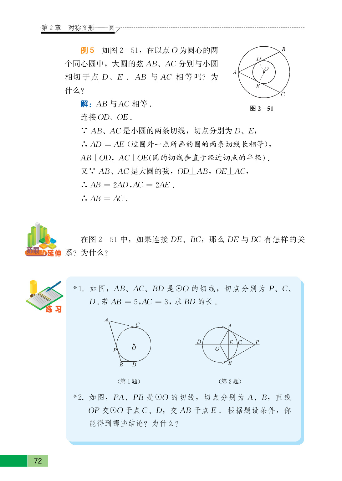 理由:$ \because AB $,$ AC $分别与小圆相切于点$ D $,$ E $,连接$ OD $,$ OE $。