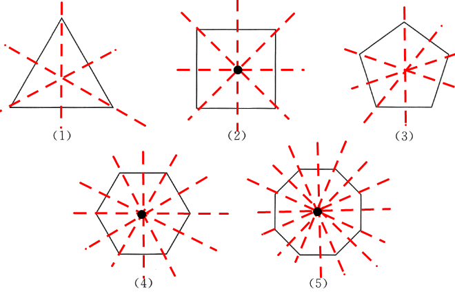 中心角:正$ n $边形的每个中心角为$ \frac{360°}{n} $外角:正$ n $边形的每个外角为$ \frac{360°}{n} $