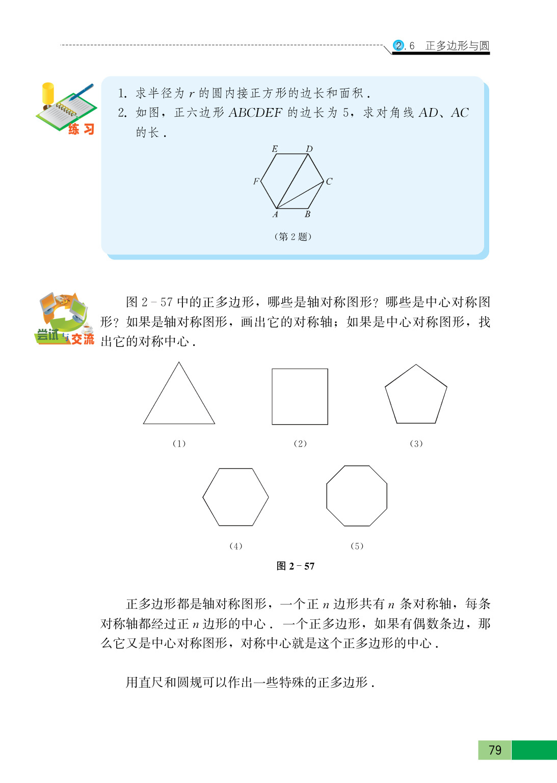 面积:正$ n $边形的面积$ S = \frac{1}{2} l r$($ l $是正$ n $边形的周长,$ r $是正$ n $边形的边心距)