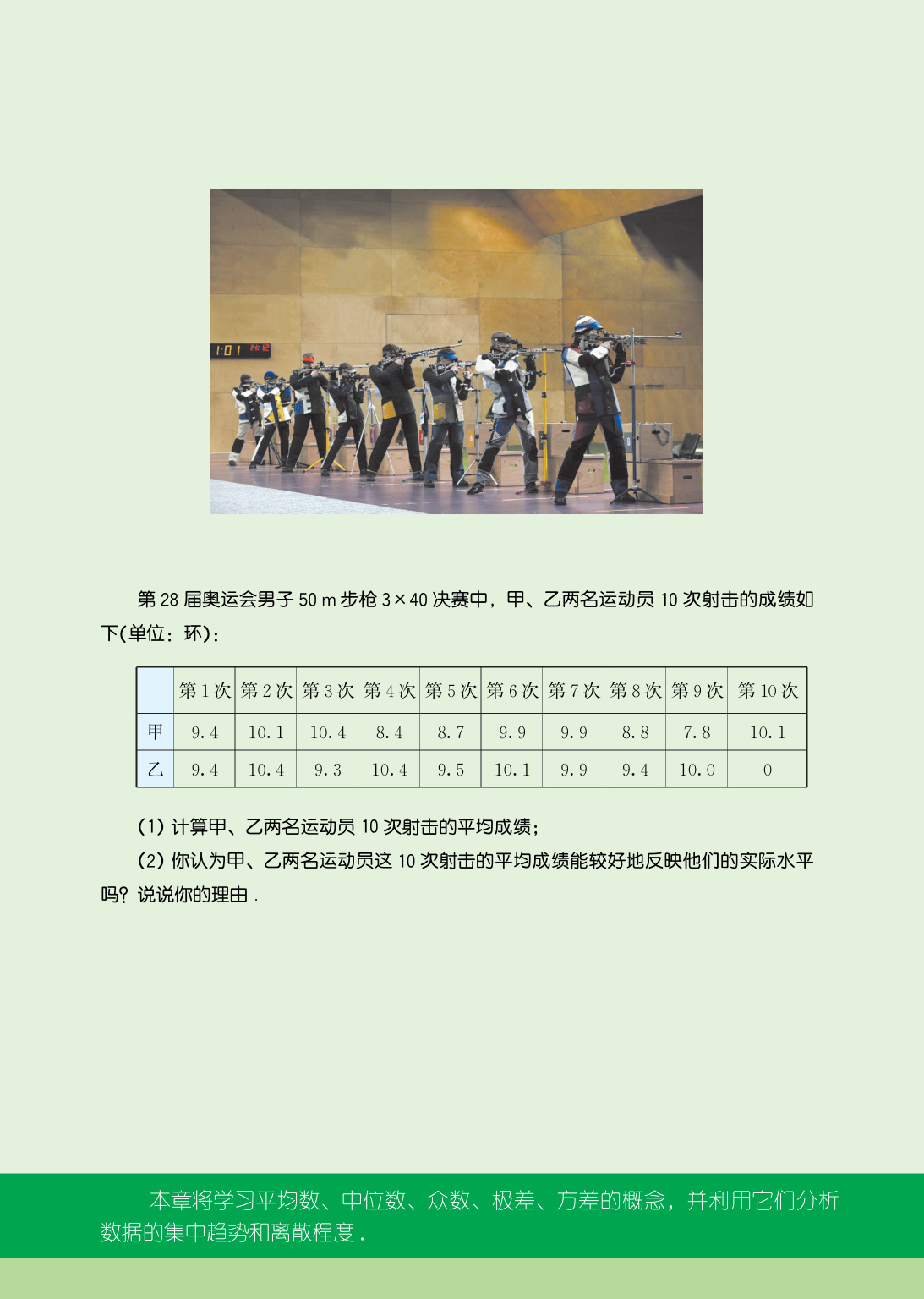 $解:(1)\overline{x}_甲=\frac {9.4+10.1+10.4+8.4+8.7+9.9+9.9+8.8+7.8+10.1}{10}=9.35(环)$