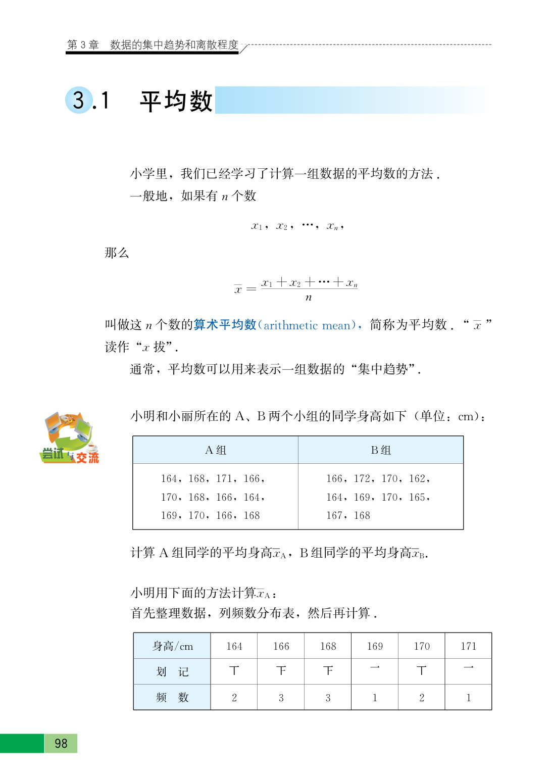 (3)算术平均数与一组数据的每一个数据都有关系,当一个数据发生变化时,会影响整组数据的平均数,所以算术平均数的缺点是容易受个别特殊值的影响,有时不能代表一组数据的平均水平.