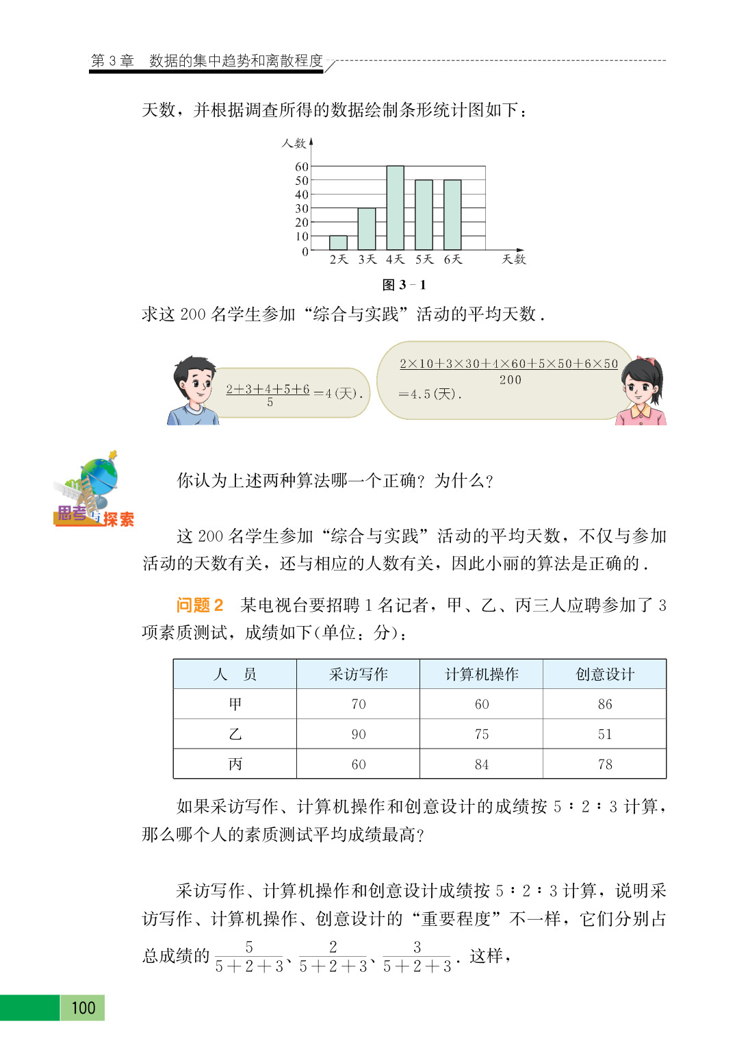 结果等于4.5天的算法是正确的. 因为这200名学生参加“综合与实践”活动的平均天数不仅与参加活动的天数有关,还与相应的人数有关,由条形统计图可以看出参加“综合与实践”活动2天、3天、4天、5天、6天的人数并不相等,分别为10人、30人、60人、50人、50人,所以结果等于4.5天的算法是正确的.