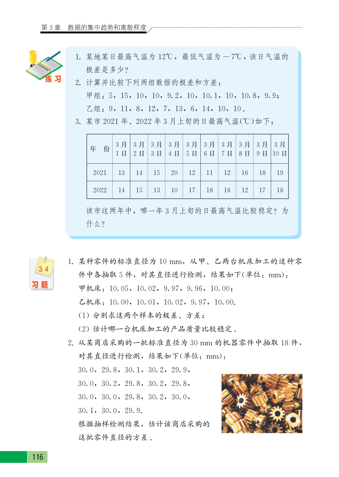 $解:(1)根据极差的定义可得:甲样本的极差是10.05-9.96=0.09\ \mathrm {mm}$