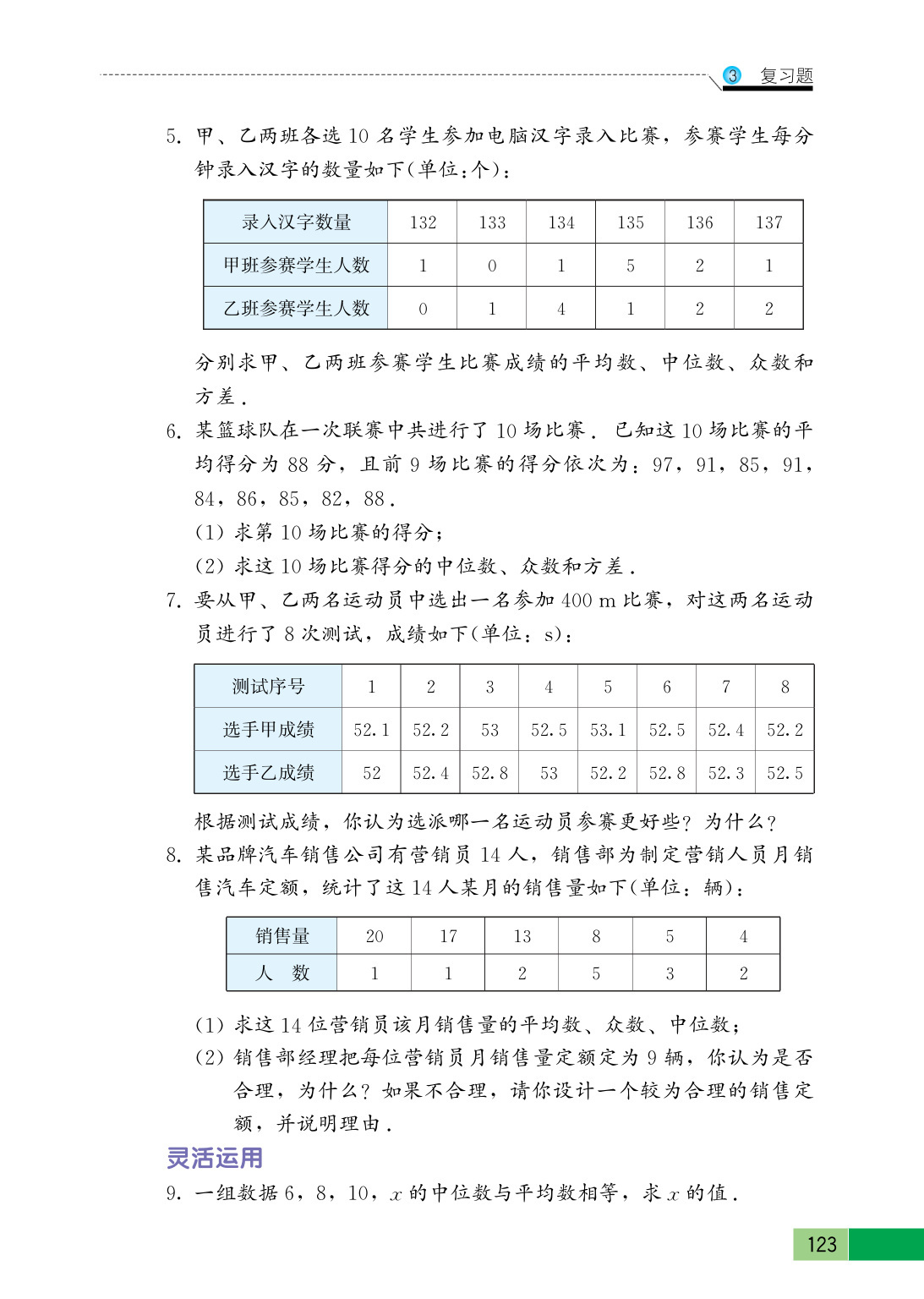 $在①中,中位数为\frac {6+8}{2}=7,平均数为\frac {6+8+10+x}{4},则有$