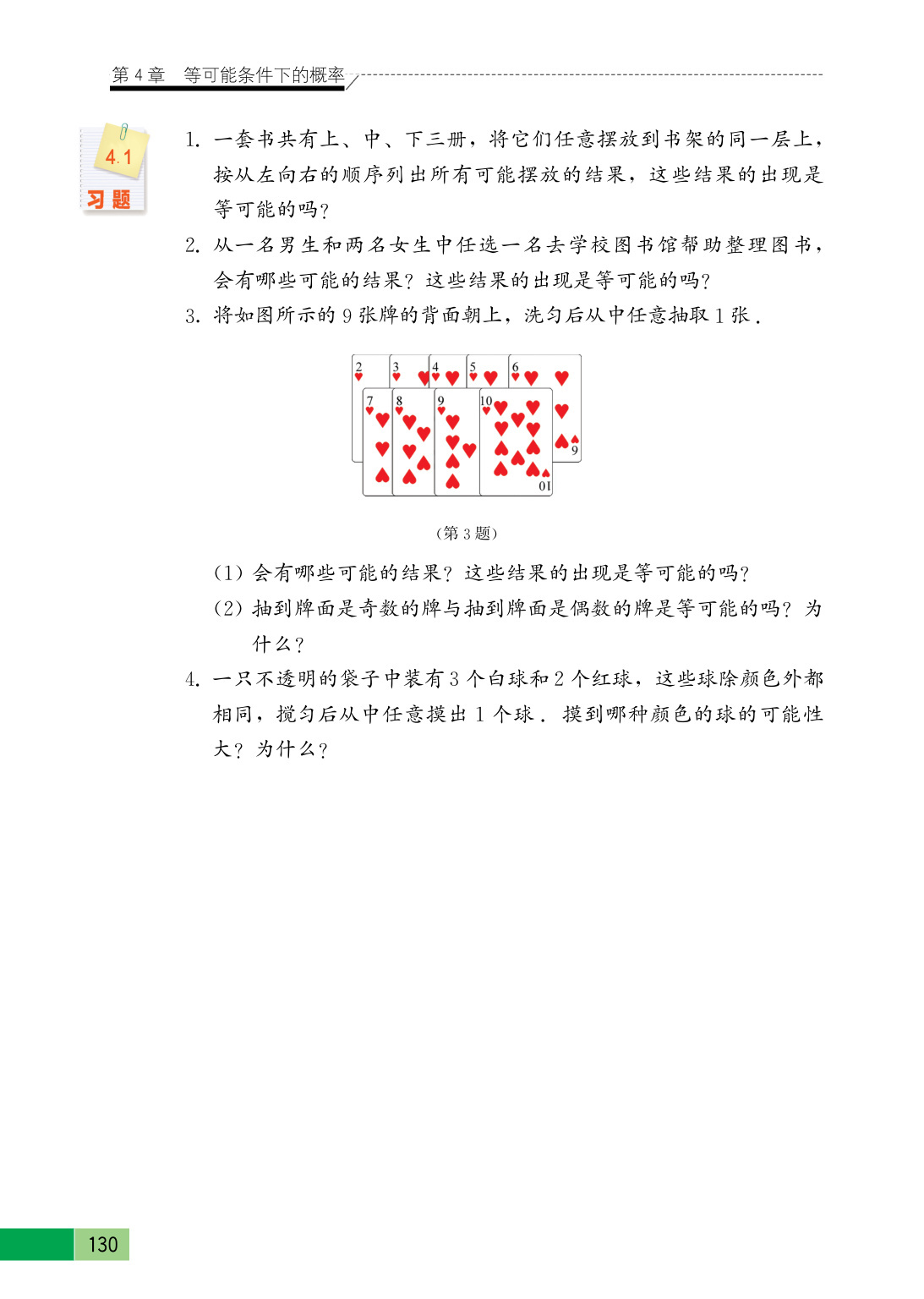 (2)抽到牌面是奇数的牌与抽到牌面是偶数的牌不是等可能的,当抽到标有3,5,7,9之一的牌时,“抽到标有奇数的牌”这一事件发生;当抽到标有2,4,6,8,10之一的牌时,“抽到标有偶数的牌”这一事件发生。因为抽到每张牌的机会是相同的,而牌面是奇数的张数是4,牌面是偶数的张数是5,所以这两件事发生的可能性不相等。