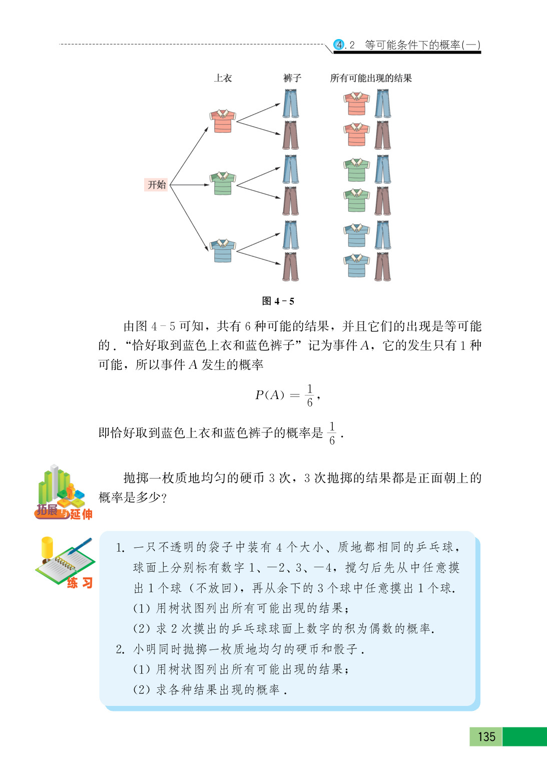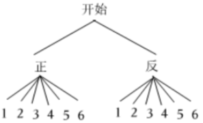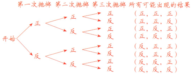 由图可知,共有8种可能出现的结果,并且它们都是等可能的,3次抛掷的结果都是正面朝上只有1种可能,所以$ P $(3次正面朝上)$=\frac{1}{8}$.