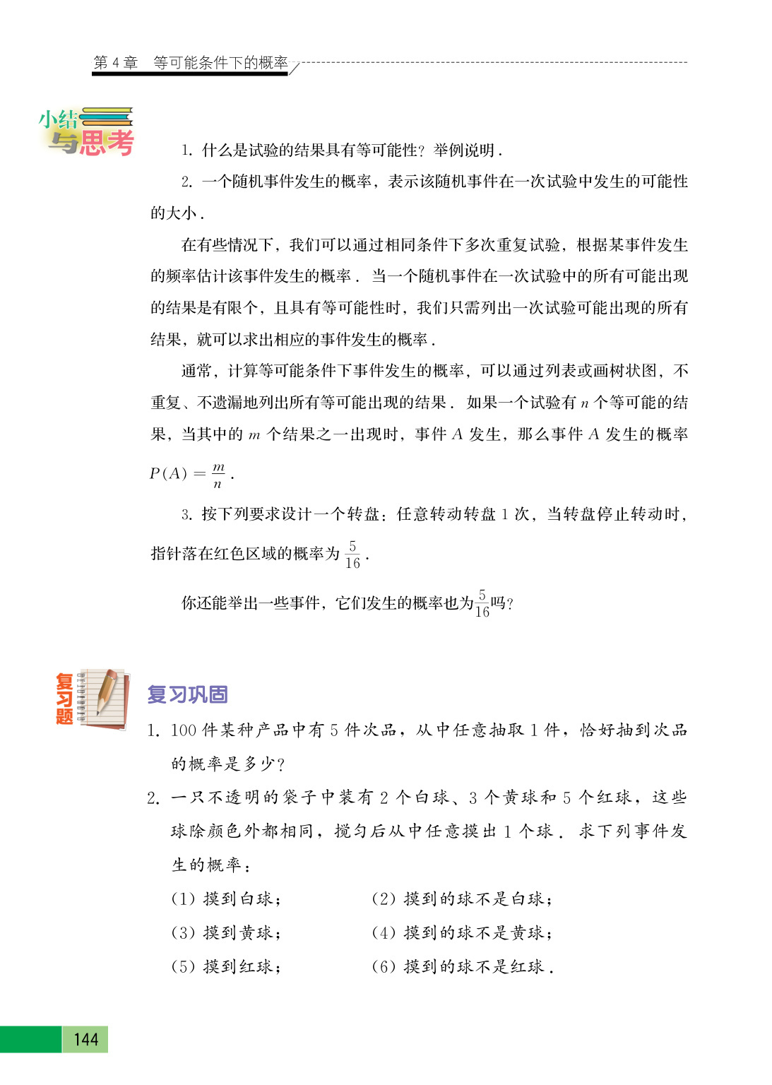 $(5)红球有5个,所以P(摸到红球)=\frac {5}{10}=\frac {1}{2};$