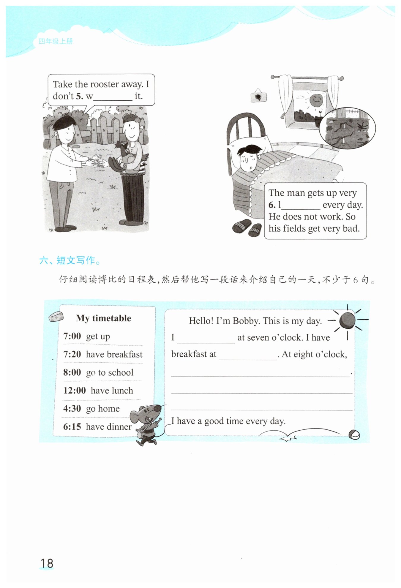 你好!我是博比。这是我的一天。我在七点钟______。我在______吃早餐。在八点钟,______。______。______。我每天都过得很愉快。