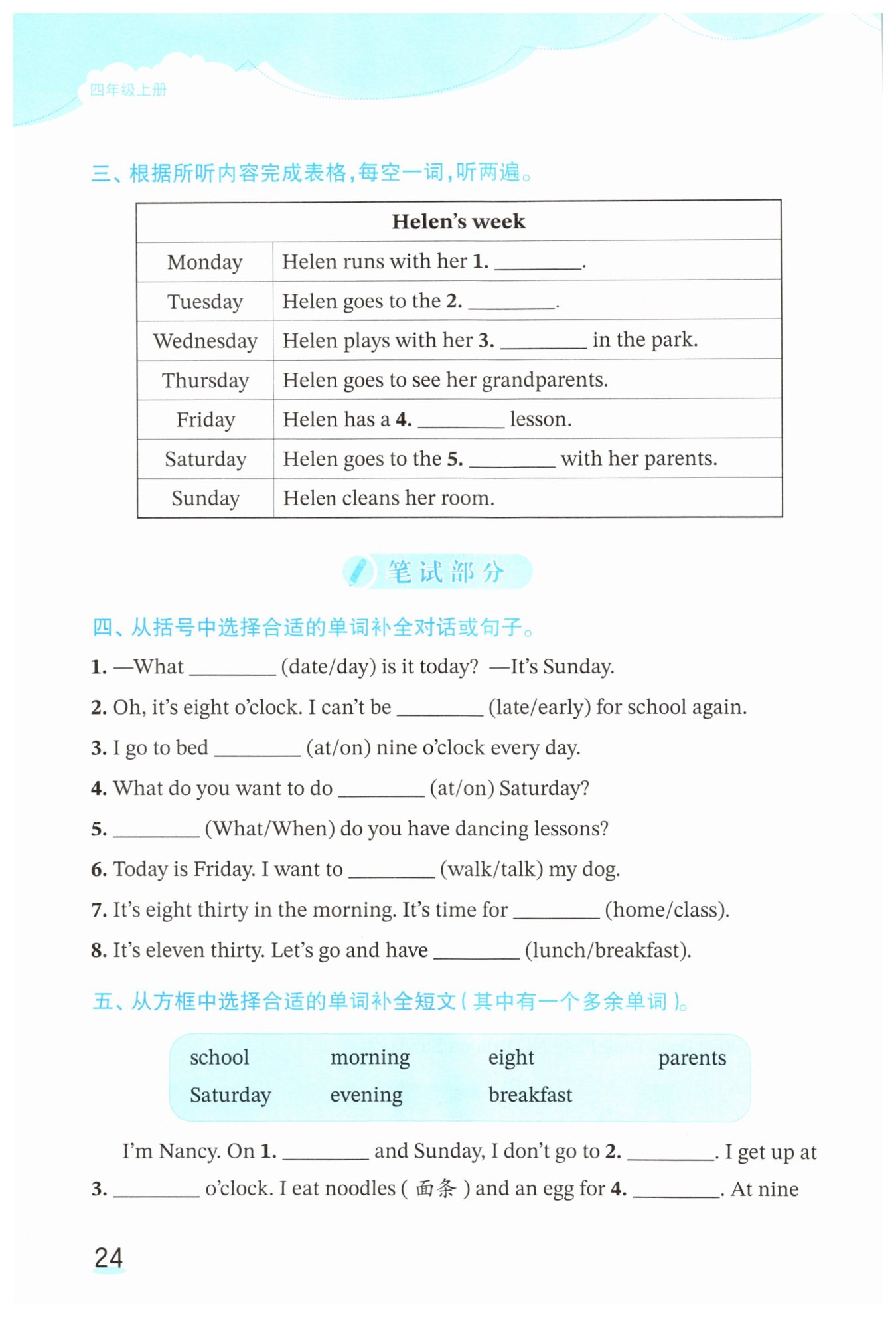1. Saturday 2. school 3. eight 4. breakfast 5. parents 6. evening