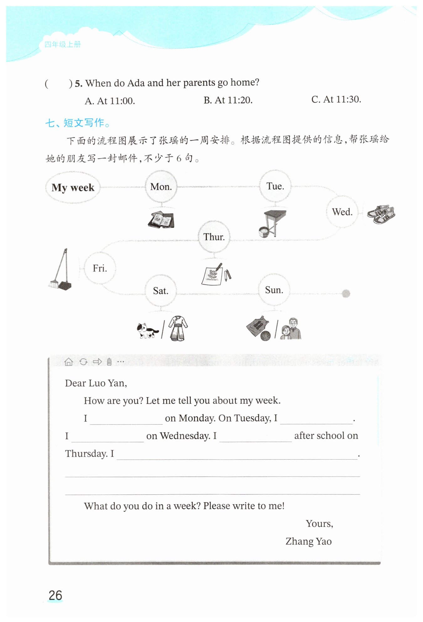 我周一______。周二,我______。我周三______。我周四放学后______。我______。______