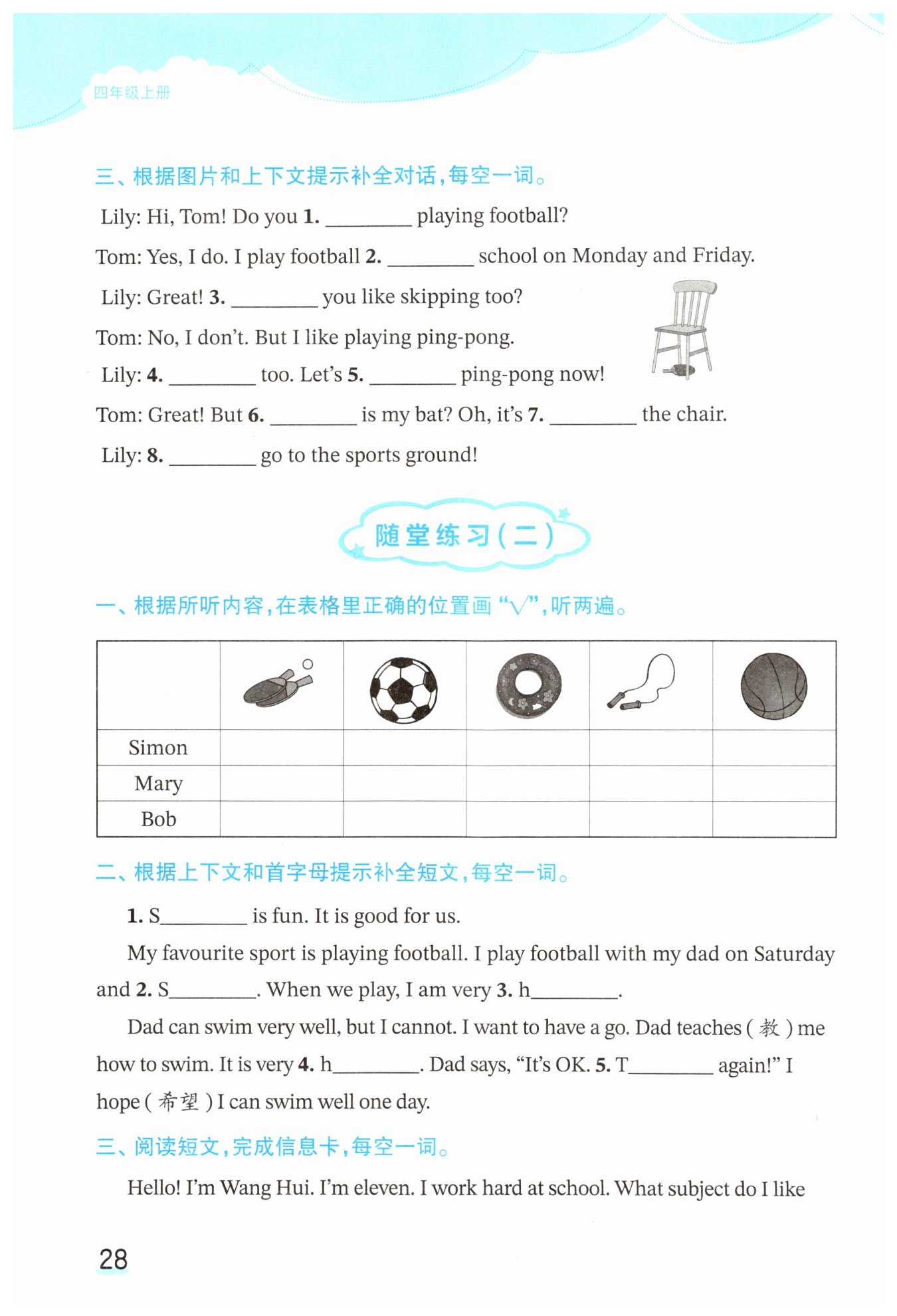 三、根据图片和上下文提示补全对话,每空一词。