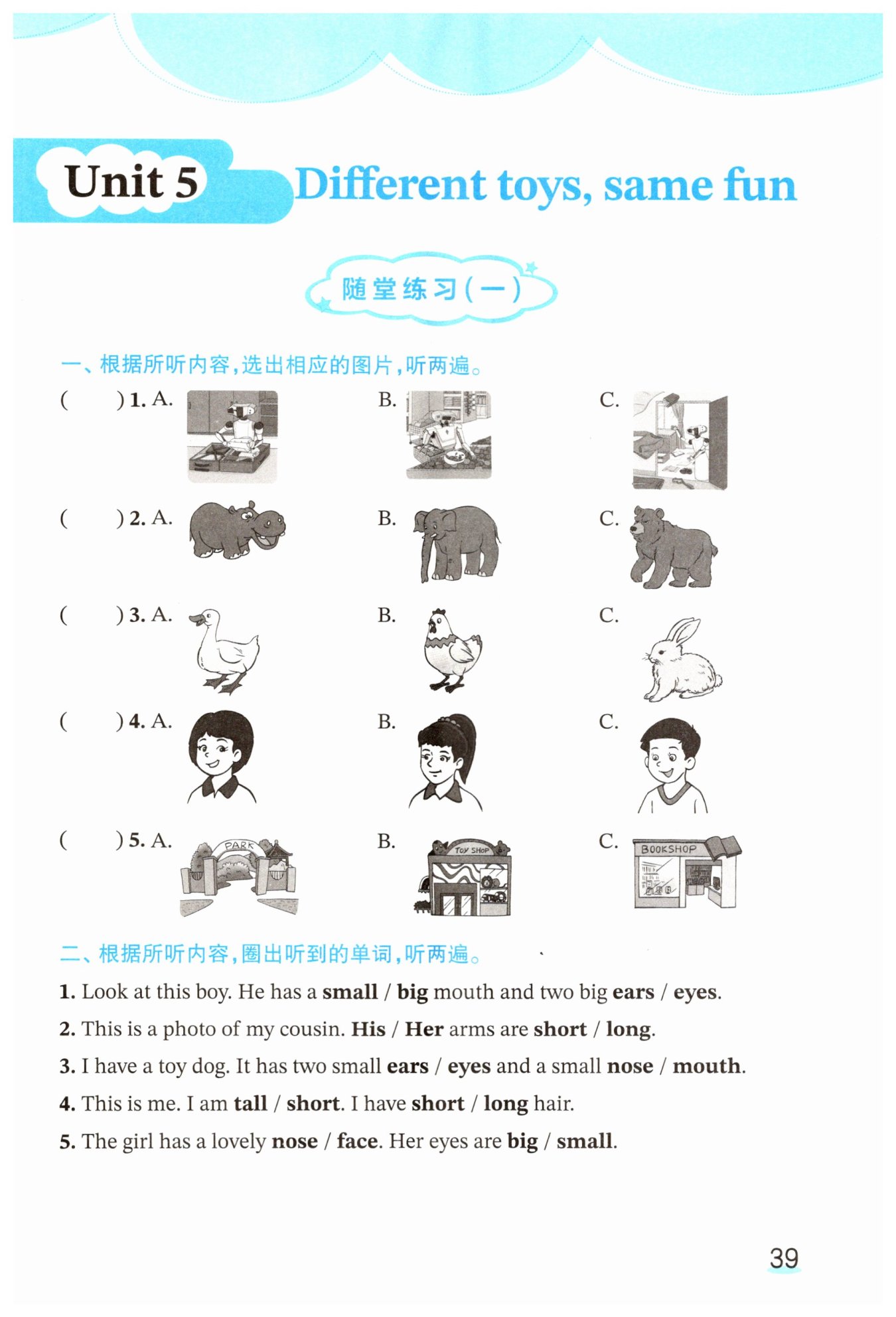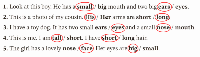 1. 看这个男孩。他有一张小的/大的嘴巴和两只大的耳朵/眼睛。