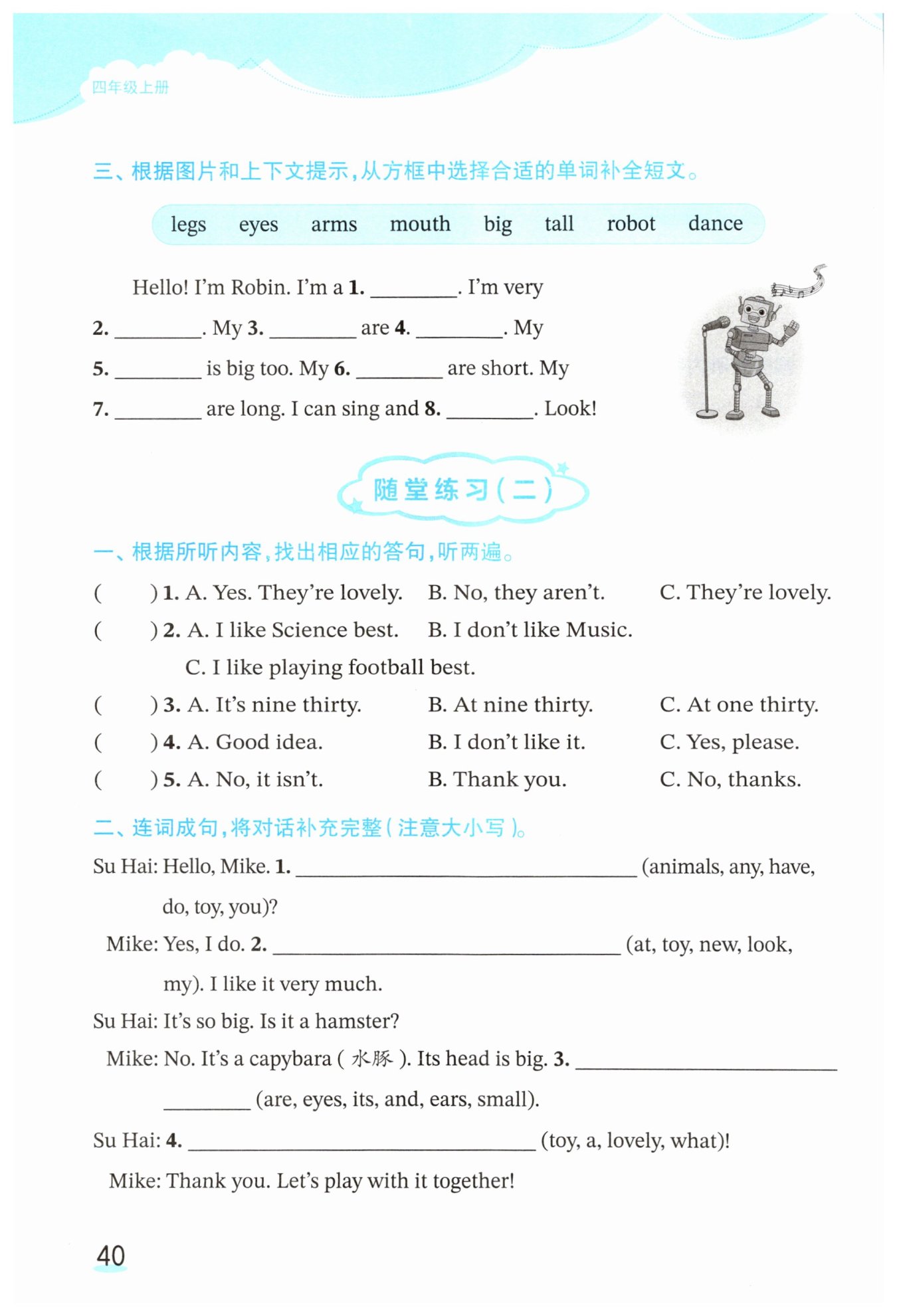 二、连词成句,将对话补充完整(注意大小写)。