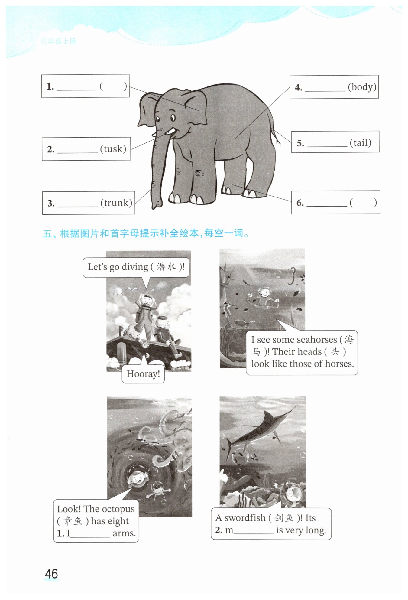 四、阅读故事,将人物的字母代号写在横线上,并在括号里补全大象的身体部位名称。