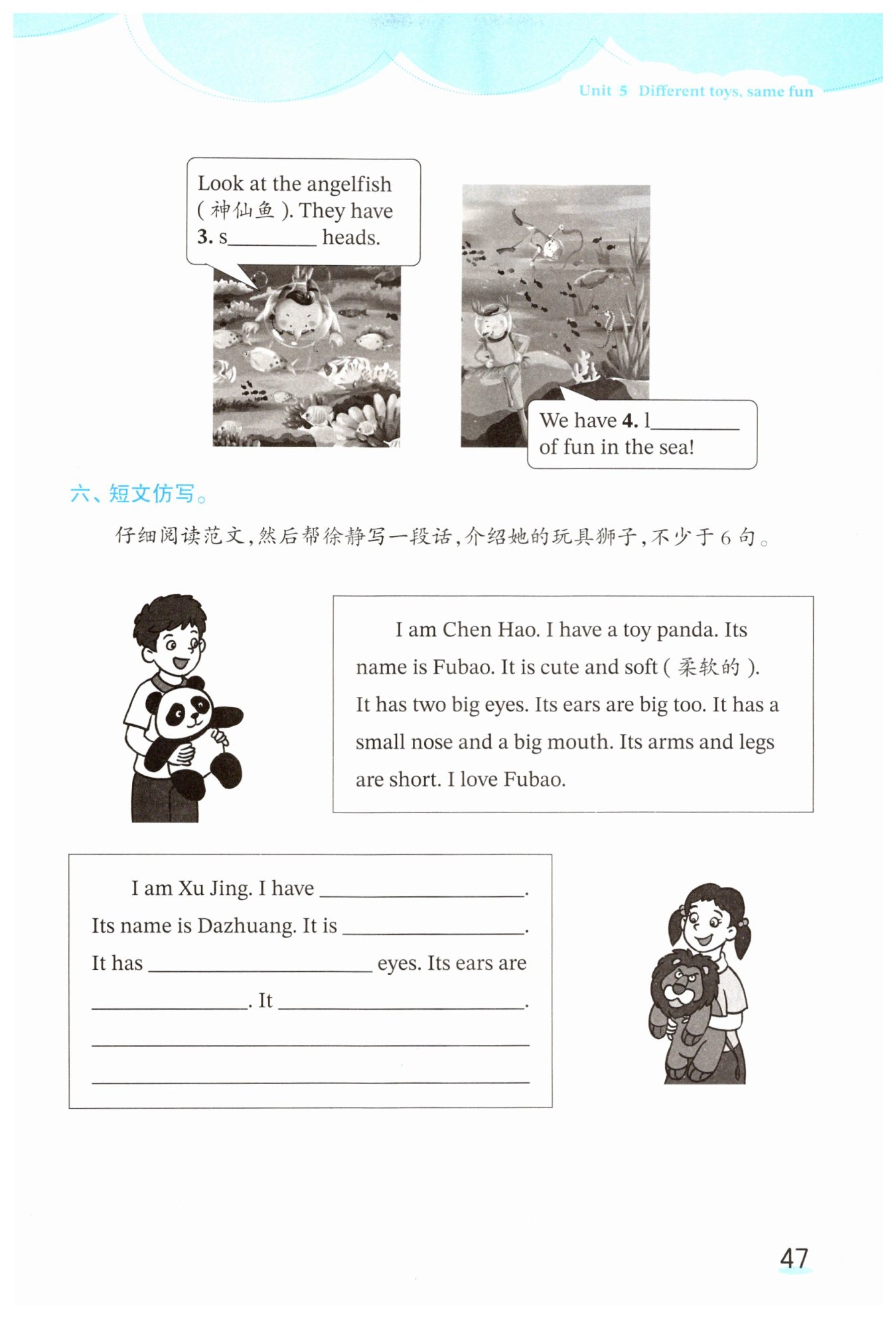仔细阅读范文,然后帮徐静写一段话,介绍她的玩具狮子,不少于6句。