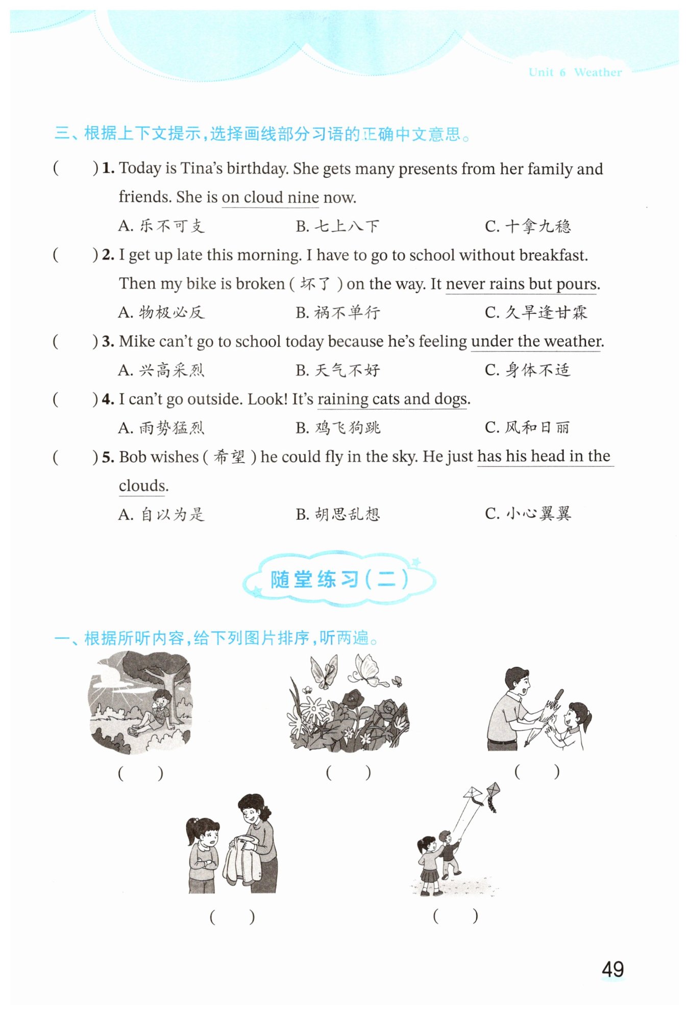 三、根据上下文提示,选择画线部分习语的正确中文意思。