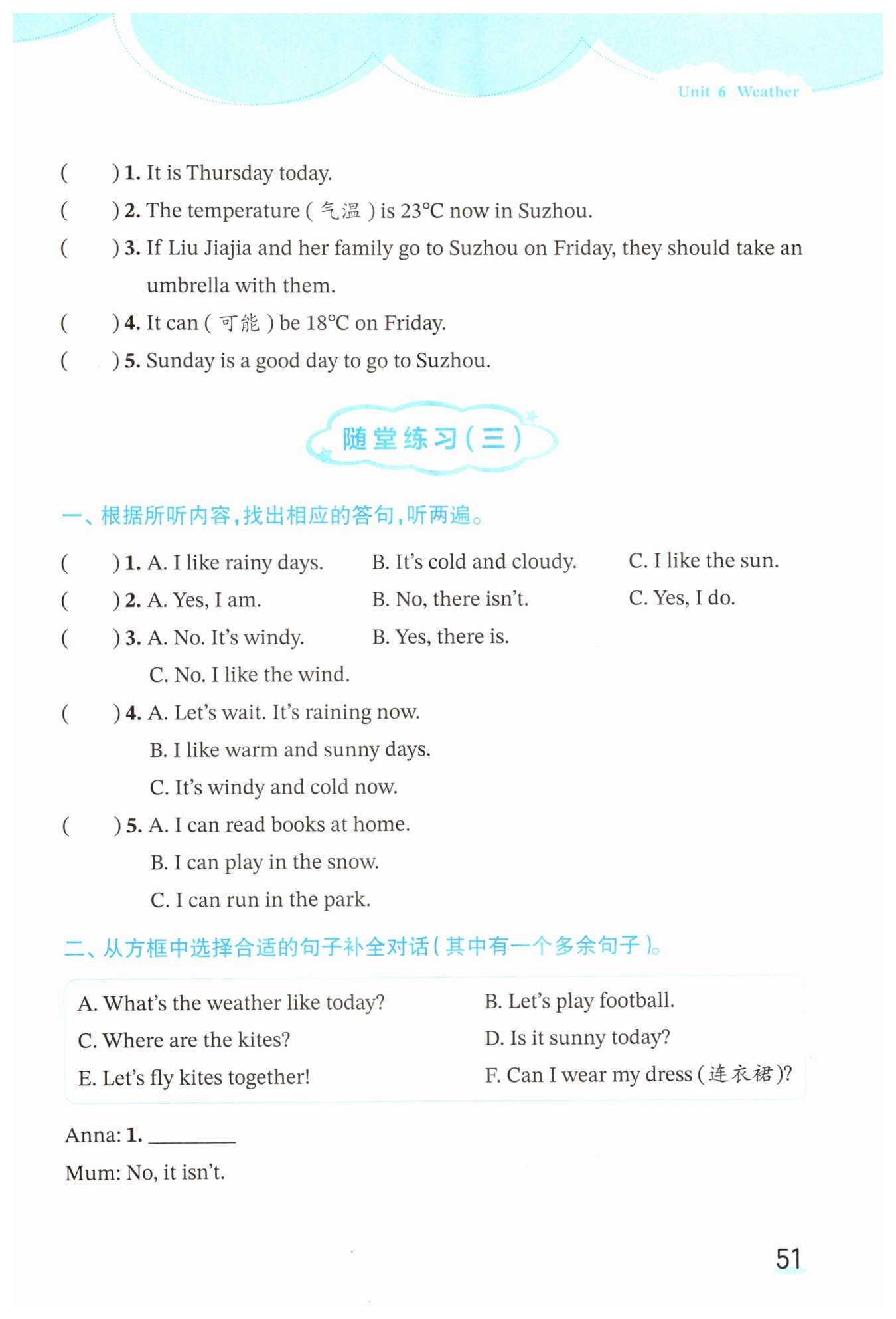 【解析】: 翻译: 一、根据所听内容,找出相应的答句,听两遍。 ( )1. A. 我喜欢雨天。B. 天气寒冷且多云。C. 我喜欢太阳。 ( )2. A. 是的,我是。B. 不,没有。C. 是的,我喜欢。 ( )3. A. 不。有风。B. 是的,有。C. 不。我喜欢风。 ( )4. A. 我们等等。现在正在下雨。B. 我喜欢温暖晴朗的日子。C. 现在有风且寒冷。 ( )5. A. 我可以在家看书。B. 我可以在雪里玩耍。C. 我可以在公园里跑步。