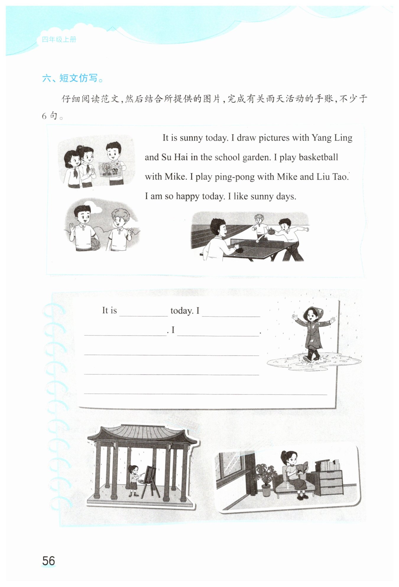 今天天气晴朗。我和杨玲、苏海在学校花园里画画。我和迈克一起打篮球。我和迈克、刘涛一起打乒乓球。我今天很开心。我喜欢晴天。