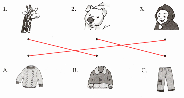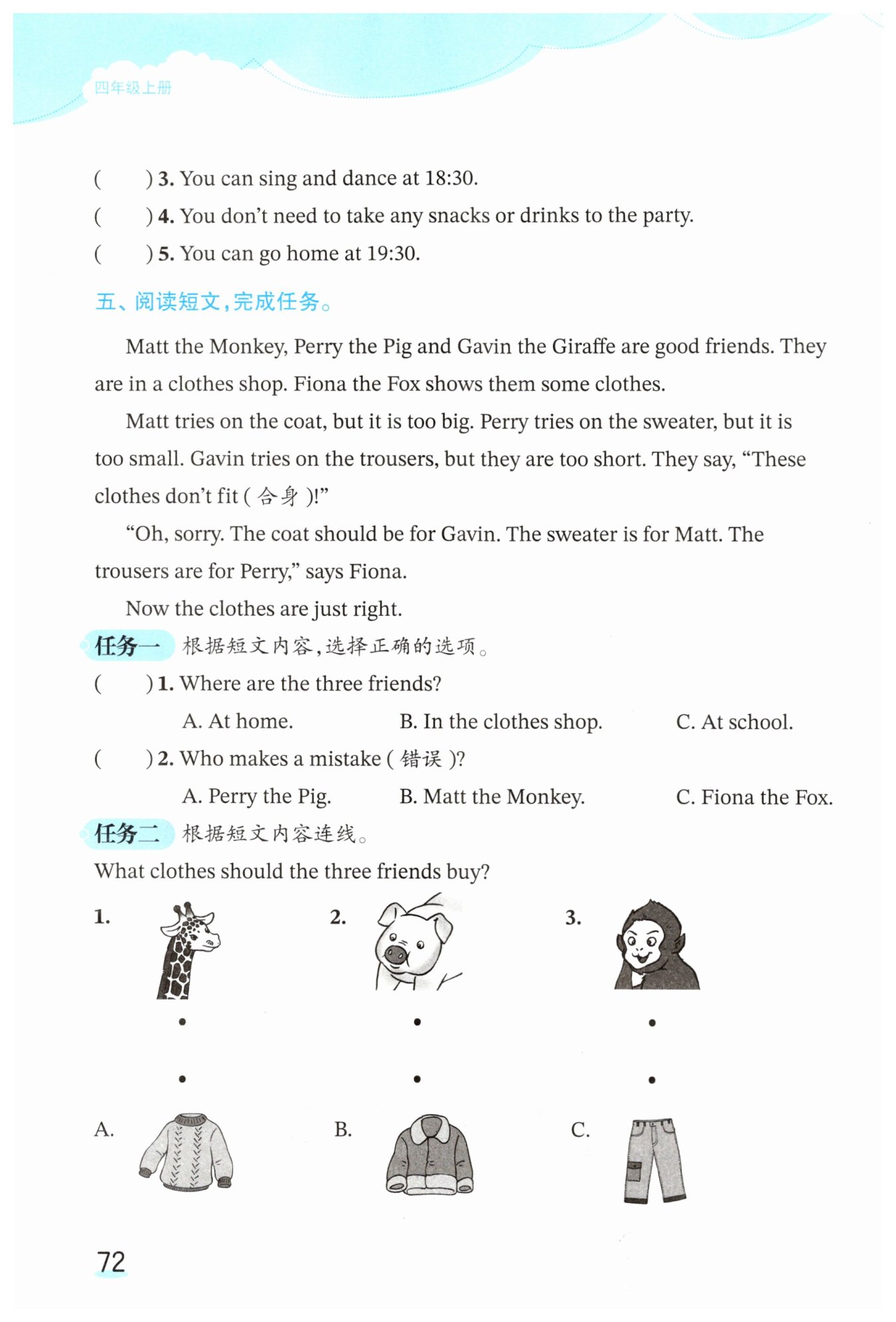 猴子马特、小猪佩里和长颈鹿加文是好朋友。他们在一家服装店。狐狸菲奥娜给他们看了一些衣服。