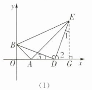 $证明:(1)如图(1),$ $过点E作EG⊥x轴于点G.\ $ $∵△BDE是等腰直角三角形,\ $ $∴∠EGD=∠DOB=∠EDB=90°,$ $ED=DB,$ $∴∠1+∠2=90°,∠2+∠3=90°,$ $∴∠1=∠3.\ $ $在△EGD和△DOB中,\ $ $∠1=∠3,\ $ $∠EGD=∠DOB,\ $ $ED=DB,\ $ $∴△EGD≌△DOB(\mathrm {AAS}),$ $∴EG=DO,GD=OB.\ $ $∵A(8.0)、B(0,8),$ $∴OB=OA=8,\ $ $∴∠OAB=45°,GD=OA,\ $ $∴DO=DA+OA=DA+DG=AG,\ $ $∴EG=AG,$ $∴∠EAG=∠GEA=45°,\ $ $∴∠EAD=∠OAB.$