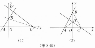 $解:(2)由(1),知AB=5,$ $则由折叠可知AC=AB=5,\ $ $∴OC=OA+AC=3+5=8.$ $∴C(8,0).\ $ $设OD=m,$ $则CD=DB=m+4.\ $ $在Rt△OCD中,DC²=OD²+OC²,\ $ $即(m+4)²=m²+8²,$ $解得m=6,$ $∴D(0,-6).$
