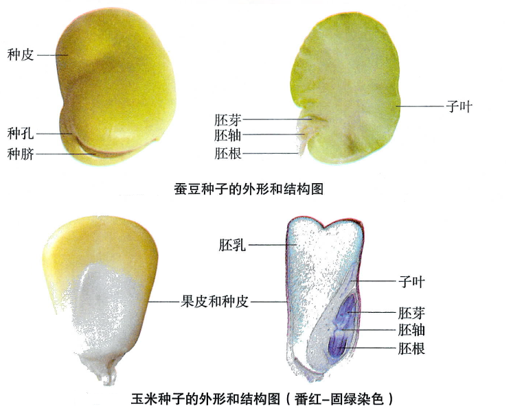 蚕豆种子由种皮和胚组成,玉米种子由种皮、胚和胚乳组成。