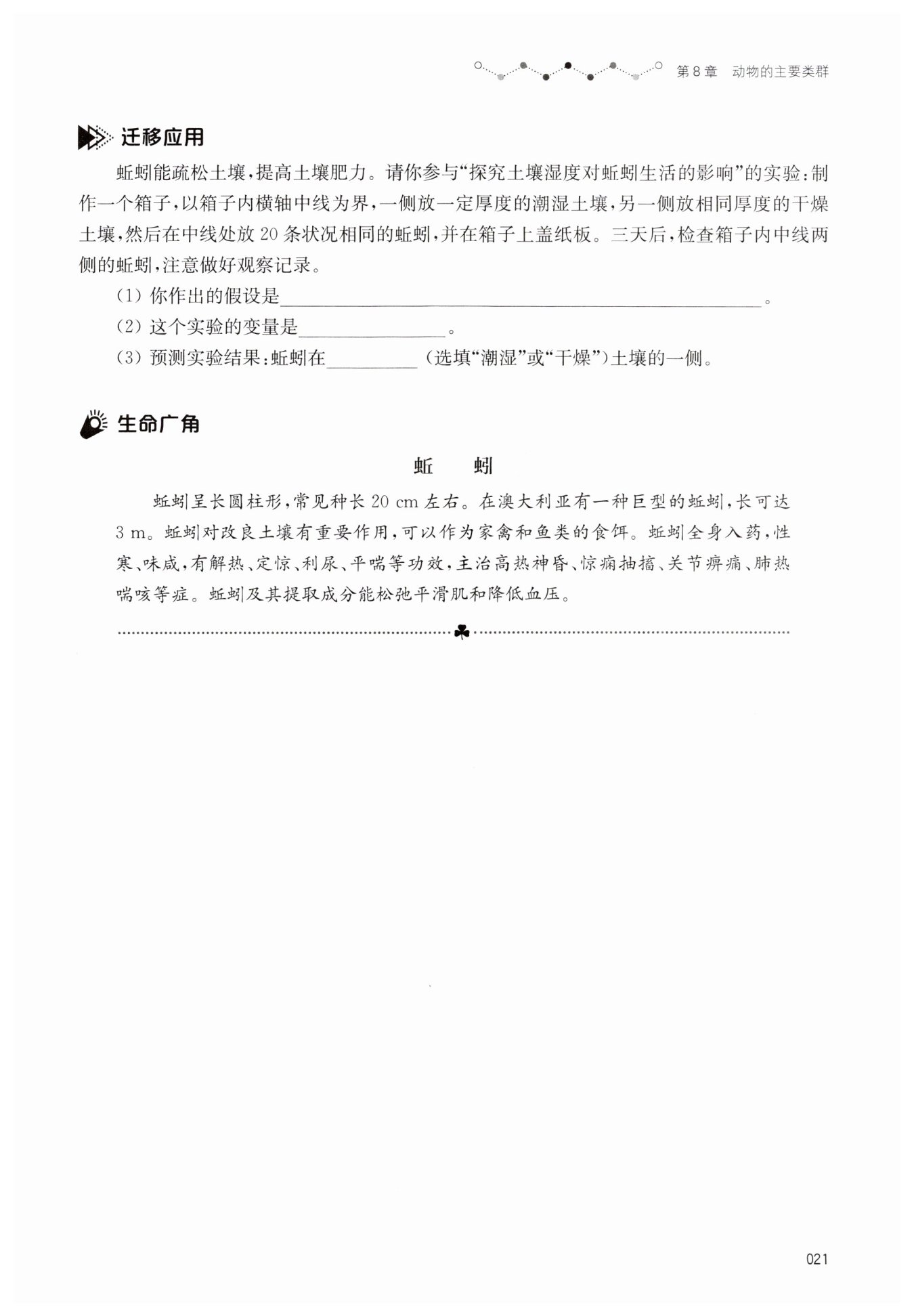 土壤湿度对蚯蚓的生活有(或无)影响