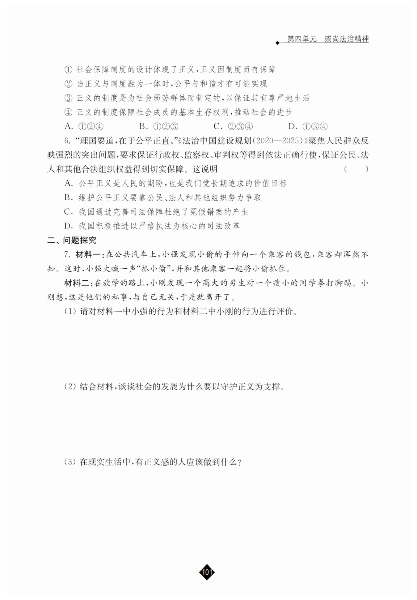 两则材料告诉我们,正义能让受害者得到救济、违法者受到惩罚,对非正义行为如果袖手旁观,任其恣意妄为、危害社会,最终会伤害到自身。正义,有利于营造和谐、稳定、安宁的社会环境,为社会发展注入不竭动力。