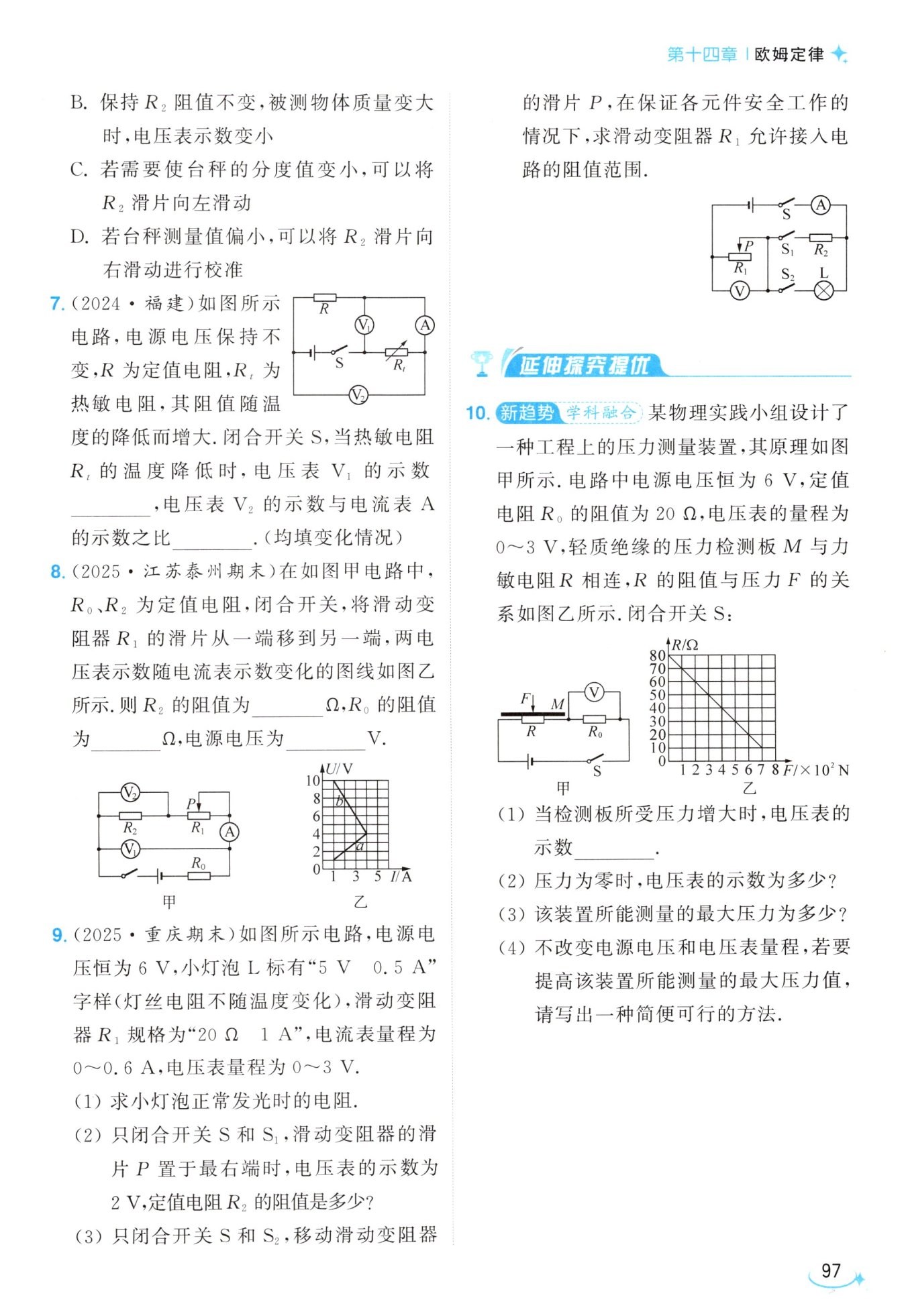 (4)若要提高该装置所能测量的最大压力值,则$R$的最小阻值$R_{小}$变小,由串联分压可知$\frac{U - U_{0大}}{U_{0大}}=\frac{R_{小}}{R_{0}},$不改变电源电压和电压表的量程,即$U$、$U_{0大}$不变,则应减小$R_{0}$的阻值,即将定值电阻$R_{0}$换为阻值较小的电阻。