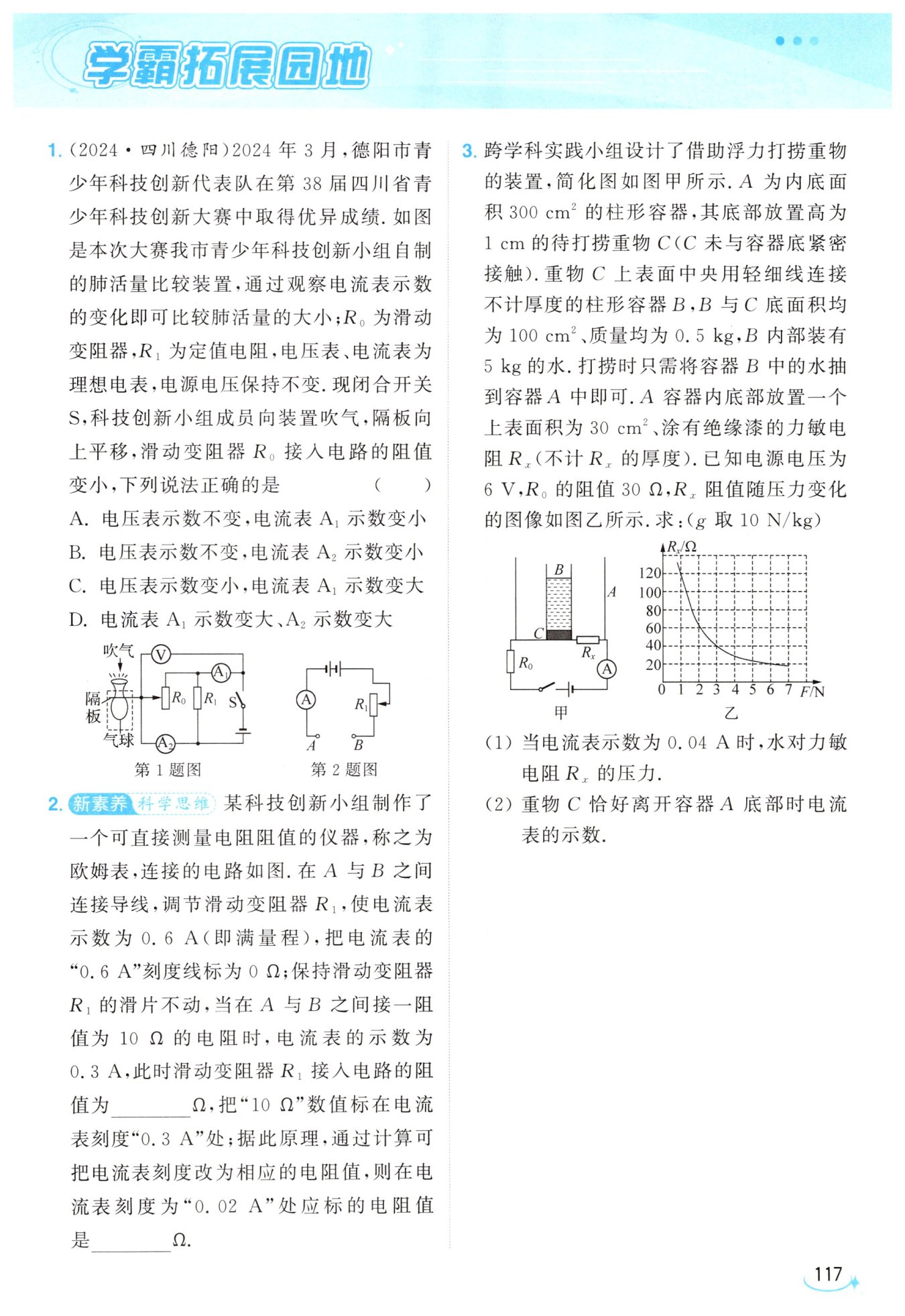 (2)由题意可知,容器$B$的重力$G_{B}=m_{B}g = 0.5kg\times10N/kg = 5N,$容器$B$中的水的重力$G_{水}=m_{水}g = 5kg\times10N/kg = 50N,$重物$C$的重力$G_{C}=m_{C}g = 0.5kg\times10N/kg = 5N。$由图甲可知,重物$C$恰好离开容器$A$底部时,由于容器$A$是柱状容器,则容器$A$底部受到的压力为重物$C$、容器$B$和水的重力之和,即容器$A$底部受到的压力$F_{A}=G_{C}+G_{B}+G_{水}=5N + 5N + 50N = 60N,$则容器$A$底部受到的压强$p=\frac{F_{A}}{S_{A}}=\frac{60N}{300\times10^{-4}m^{2}}=2\times10^{3}Pa,$由$p = \frac{F}{S}$可得,力敏电阻$R_{x}$受到的压力$F = pS_{x}=2\times10^{3}Pa\times30\times10^{-4}m^{2}=6N,$由图乙知此时力敏电阻的阻值$R_{x}' = 20\Omega,$由$I = \frac{U}{R}$可得,此时电流表示数$I'=\frac{U}{R_{x}'+R_{0}}=\frac{6V}{20\Omega + 30\Omega}=0.12A。$