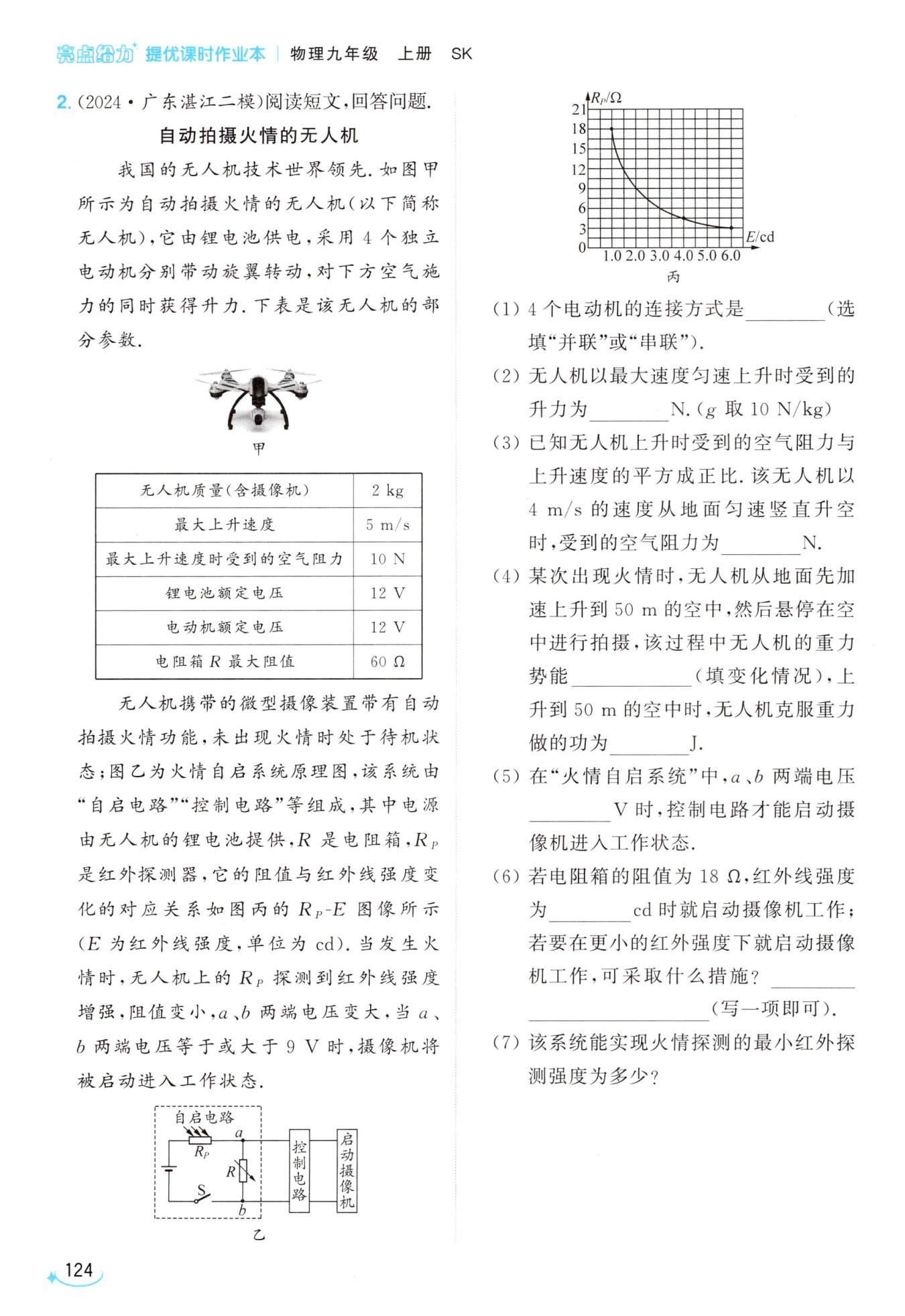电源电压$U = 12V,$根据串联电路电压规律$U = U_{R}+U_{P},$可得红外探测器$R_{P}$两端的电压$U_{P}=U - U_{R}=12V - 9V = 3V。$