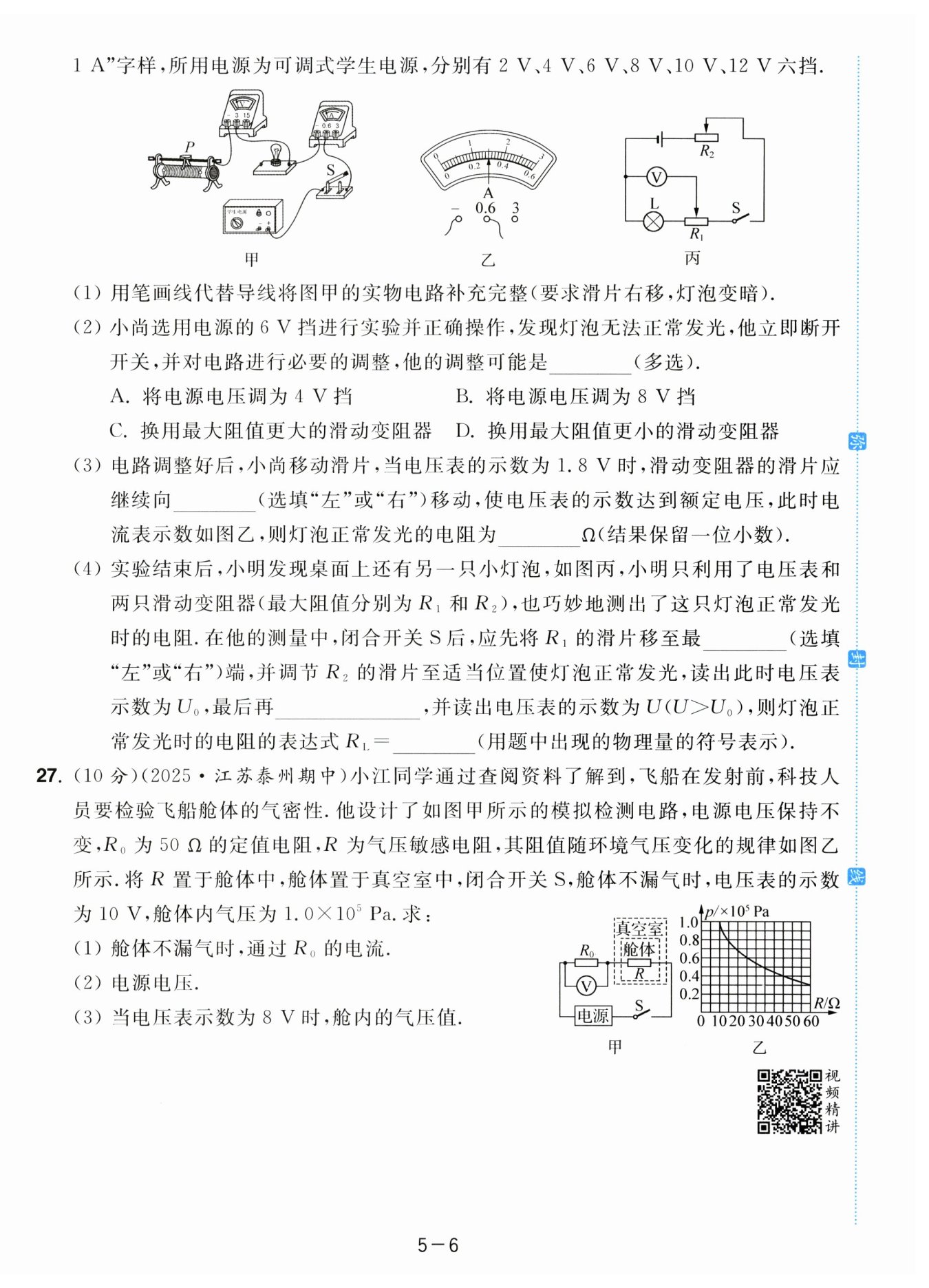 (1)解:由图甲可知,定值电阻$R_{0}$与气压敏感电阻$R$串联,电压表测$R_{0}$两端的电压,舱体不漏气时,电压表的示数为$10\ V,$根据$I = \frac{U}{R}$可得,通过$R_{0}$的电流$I_{0}=\frac{U_{0}}{R_{0}}=\frac{10\ V}{50\ \Omega}=0.2\ A。$