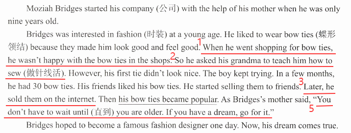 布里奇斯在很小的时候就对时装感兴趣。他喜欢戴蝶形领结,因为蝶形领结让他看起来好看,也感觉很好。当他去商店买蝶形领结时,他对商店里的蝶形领结不满意。所以他让奶奶教他做针线活。然而,他的第一条领结看起来不好看。这个男孩不断尝试。几个月后,他有了30条蝶形领结。他的朋友们喜欢他的蝶形领结。他开始把它们卖给朋友们。后来,他在网上售卖它们。然后他的蝶形领结变得受欢迎起来。正如布里奇斯的母亲所说:“你不必等到年龄更大。如果你有梦想,就去追求它。”